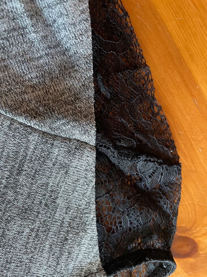 Taille L Gris avec effet pailleté Bas du pull voile noir Les épaules sont en dentelle noire