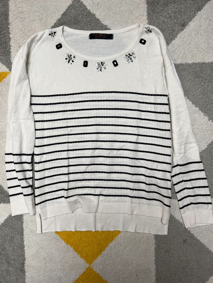 Pull Cache cache Univers : Femmes Taille : 0/XS Couleur : Blanc et noir Matières : - État : Très bon état 💫Me contacter par message pour créer un lot : 💸 -10% dès deux articles achetés! 💸 #Pull #Sweat #Cachecache #XSmall #Secondhand