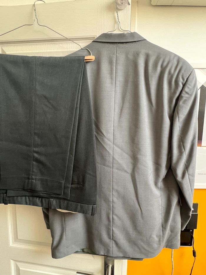 Costume composé d'un pantalon T.44 en très bon état de couleur gris foncé et d'une veste de la marque Devred T.XL de couleur grise claire, porté une fois.