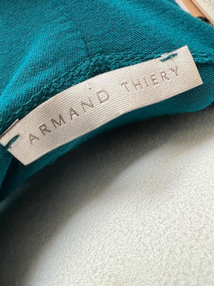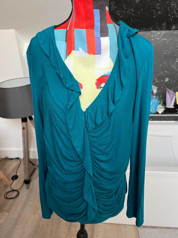 Haut Armand Thiery de couleur turquoise, correspond à une taille L. En bon état.