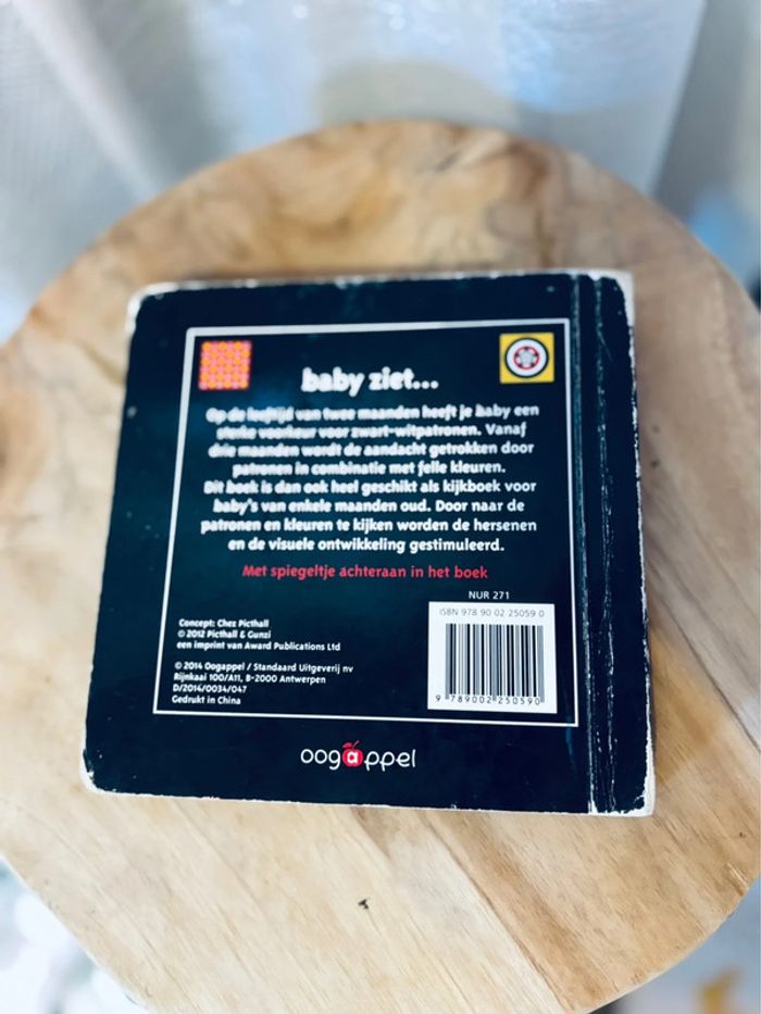 Bébé voit… À l’âge de deux mois, votre bébé a une forte préférence pour les motifs en noir et blanc. À partir de trois mois, son attention est attirée par des motifs combinés à des couleurs vives. Ce livre est donc très adapté comme livre d’observation pour les bébés de quelques mois. En regardant les motifs et les couleurs, le cerveau et le développement visuel sont stimulés. Avec un petit miroir à la fin du livre