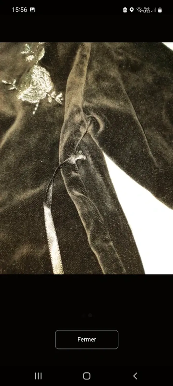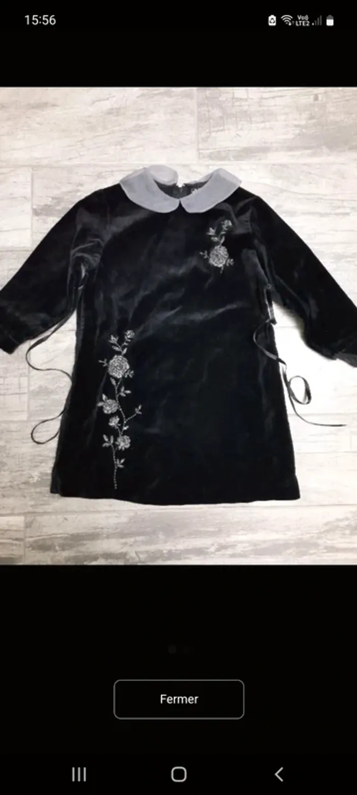 4 ans. Vynil fraise. Robe en velours noir. Un peu décousue à la manche et à la ceinture.