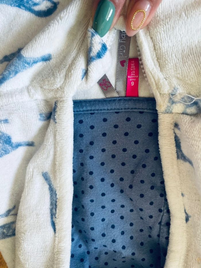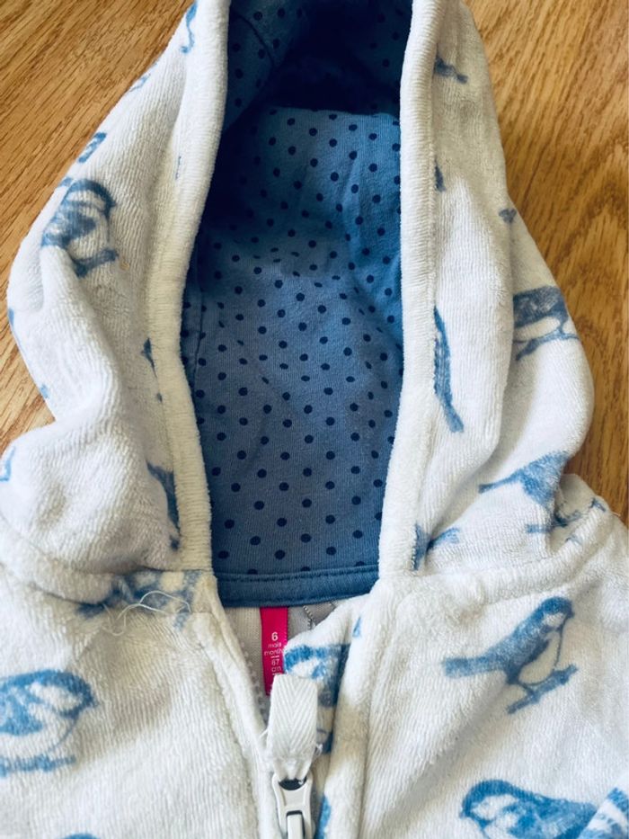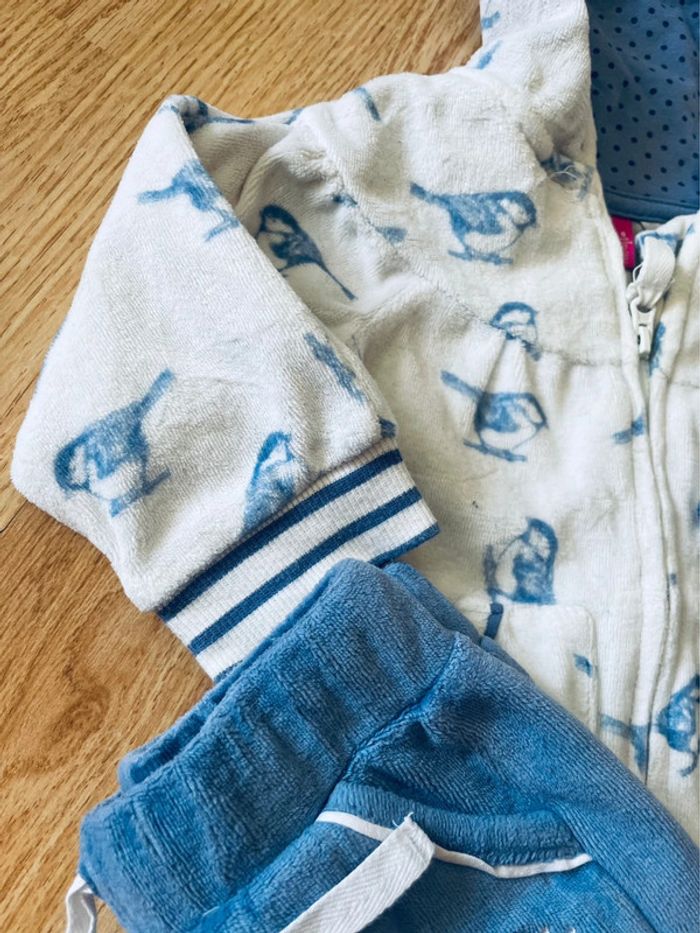 Bleu et blanc avec jolie motif oiseau 🐦 Bon état général le cordon du pantalon est à retirer car est rentré à l intérieur 6 mois