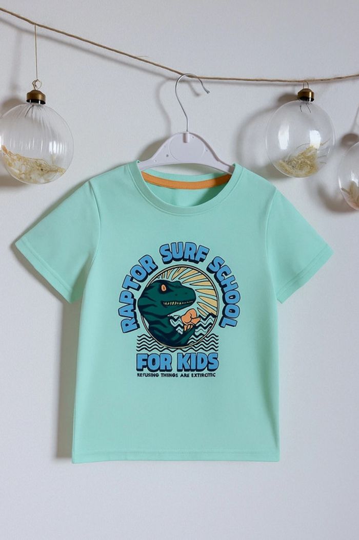 Parfait pour les petits fans de raptors et d’aventures jurassiques ! Ce joli t-shirt “Raptor Surf School for Kids” est plein de style avec son dinosaure cool et ses couleurs punchy 💙🌞