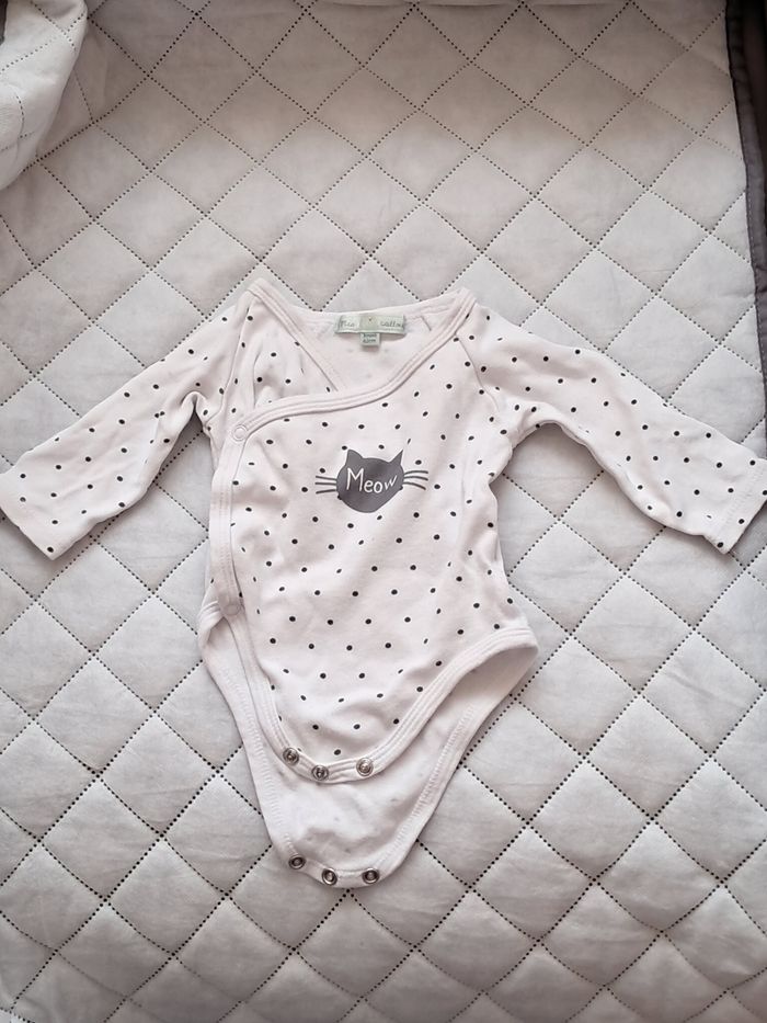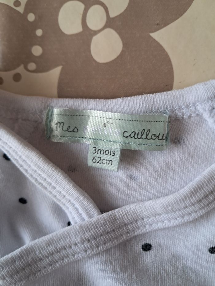 Bodie LM blanc à motif, ouverture devant. 3 mois 62cm Pour information, je vends les vêtements de la famille, amies et enfants toutes tailles et saisons Jouets, doudous, peluches etc.... Je vais mettre des vêtements 1 à 12 mois fille née en juillet 2024
