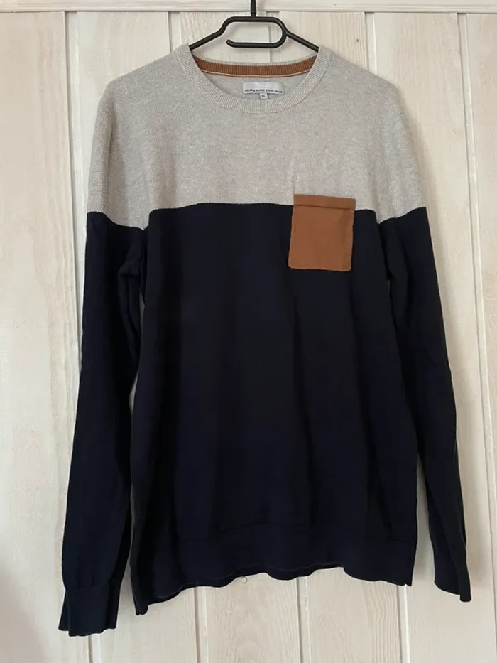 Pull avec haut gris et bas bleu marine et poche camel Marque Jules Taille XL #sdelandeH #sdelandeHtailleXL