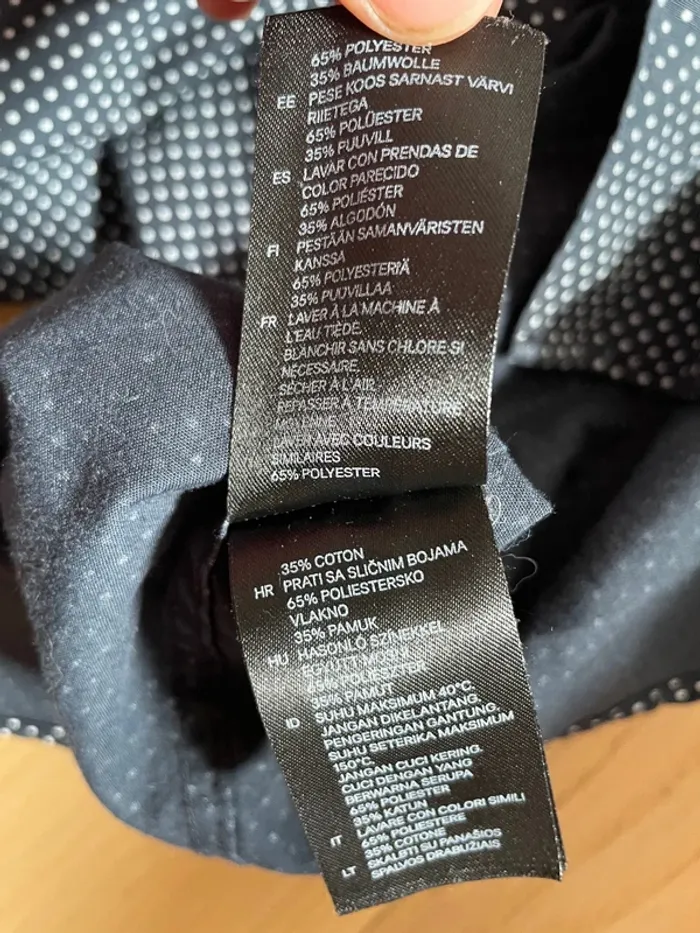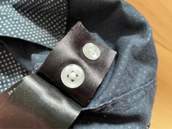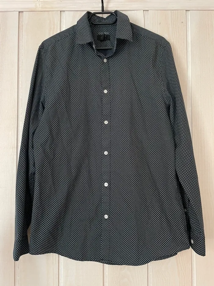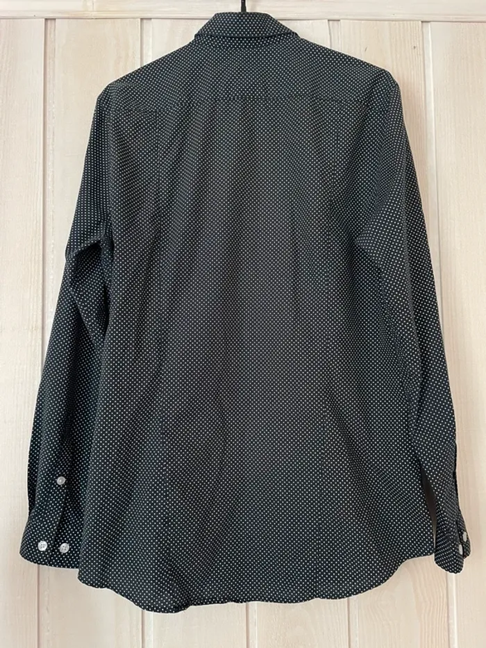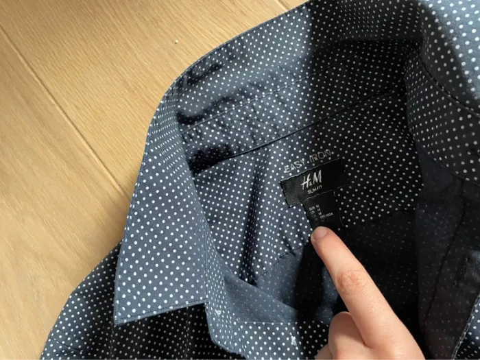 Chemise à manches longues bleu marine à petits pois blancs Marque H&M Taille M Coupe Slim Fit A noter : pois un peu effacés au pli du col et aux aisselles #sdelandeH #sdelandeHtailleM