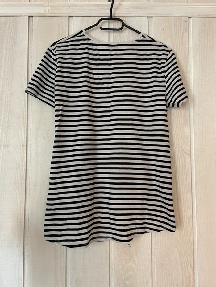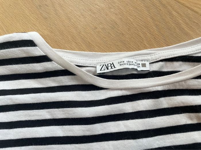 Tee-shirt à manches courtes coupe loose Blanc à rayures noires Plus long à l’arrière avec arrondi Marque Zara Taille M #sdelandeF #sdelandeFm38