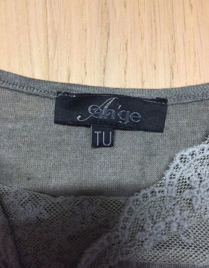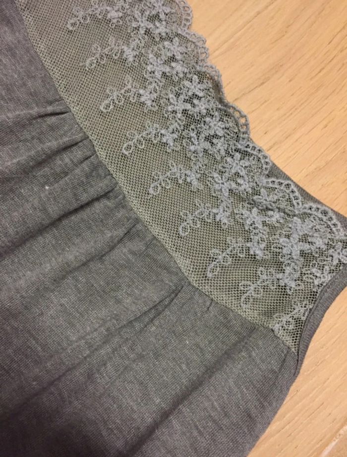 Robe fine d’été assez courte (ou nuisette) Dentelle dans le bas et sur le col Couleur gris kaki Bretelles réglables Marque An’ge Taille Unique 50% viscose 50% laine #sdelandeF