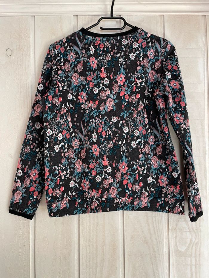 Sweat noir fleuri tons rose/bleu/blanc Col et bouts de manches pailletés Marque Naf Naf Taille S étiquette, mais taille petit : plutôt XS