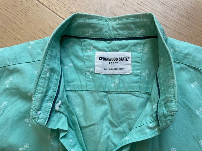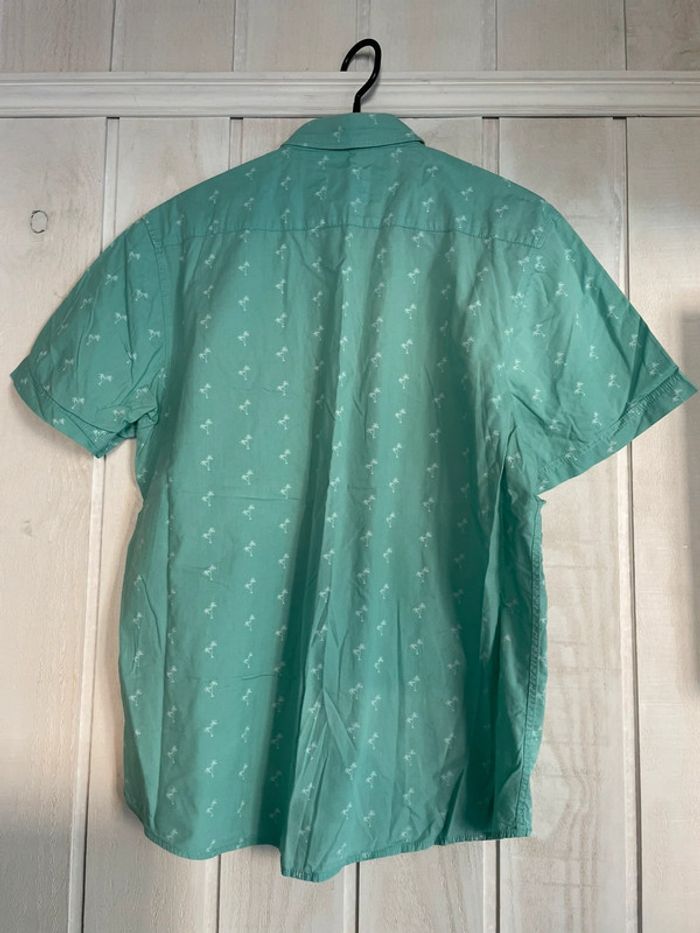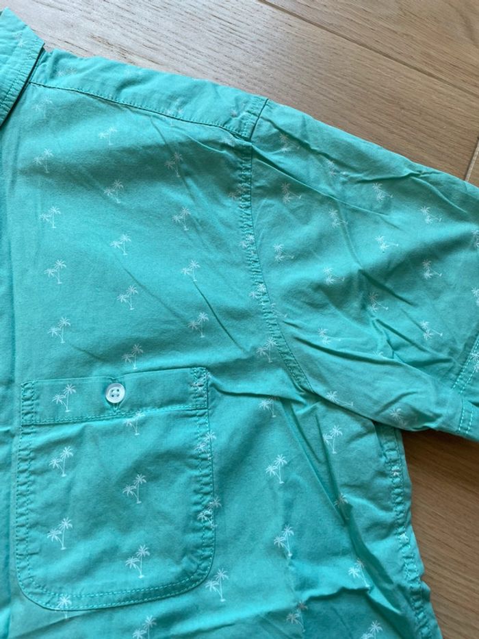 Chemise à manches courtes vert d’eau/turquoise/verte-bleue avec motifs palmiers Une poche devant Marque Cedarwood State (Primark) Taille L #sdelandeH #sdelandeHl