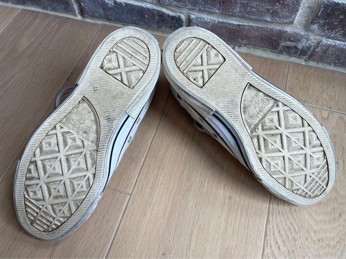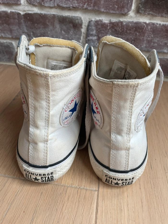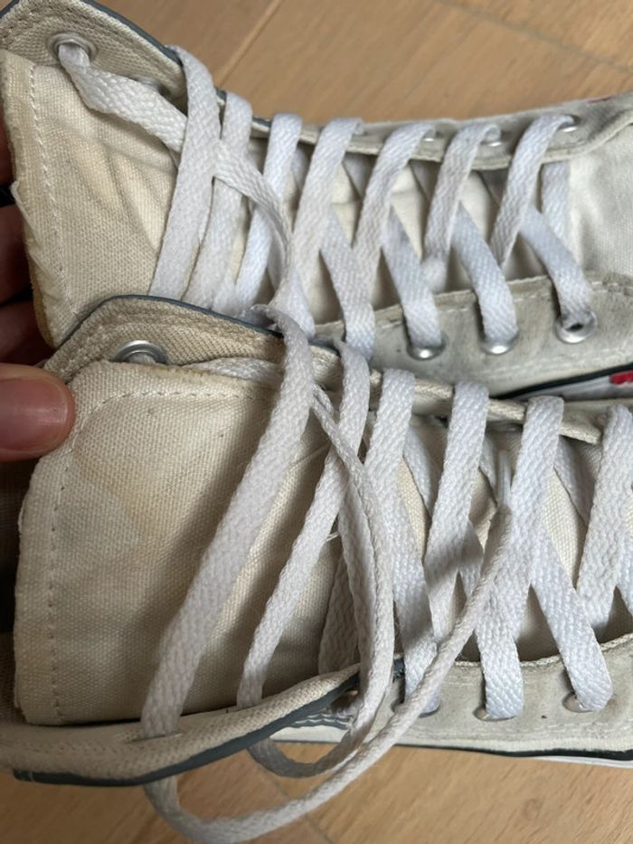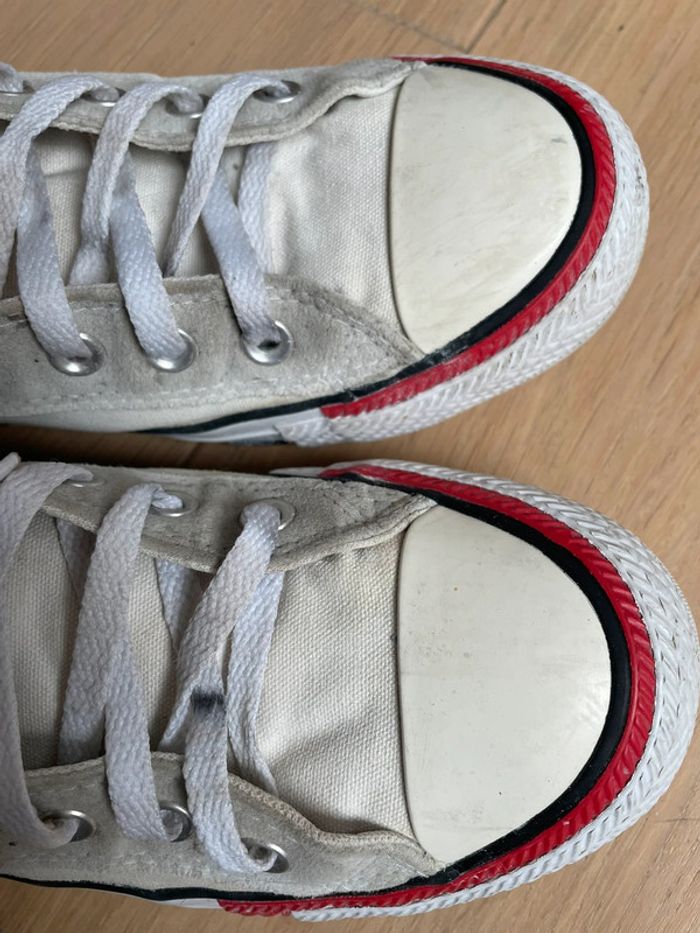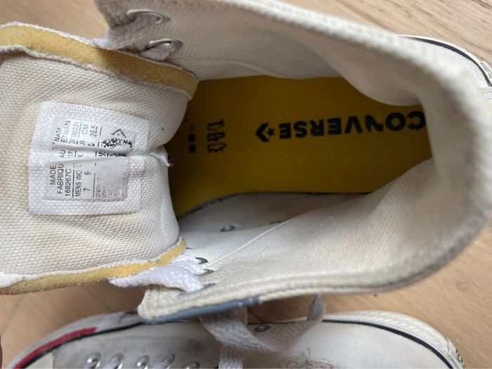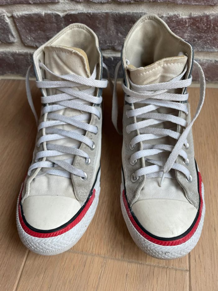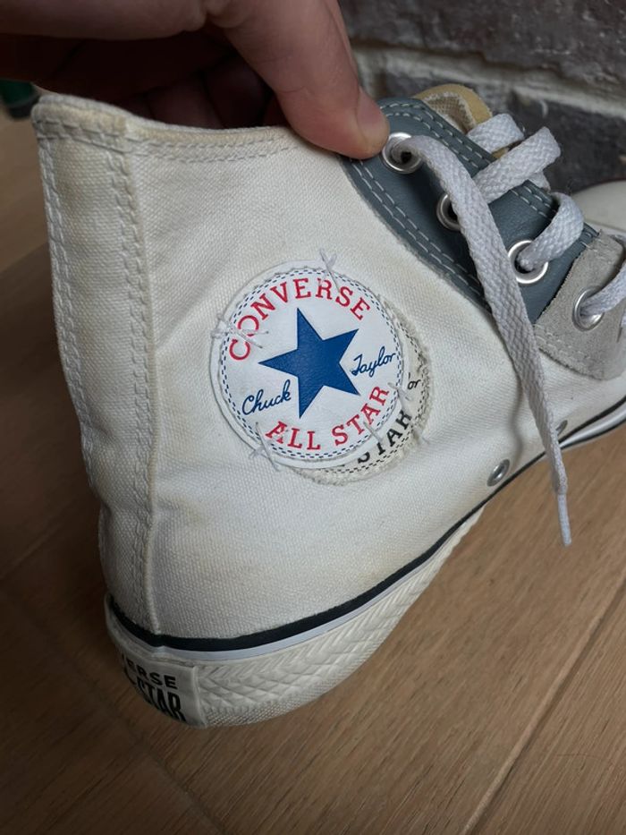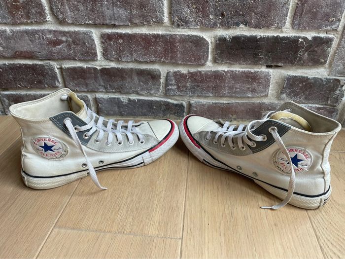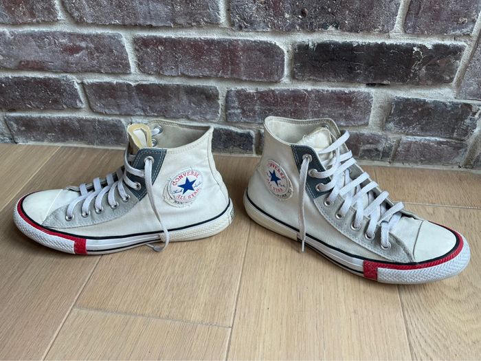 Chaussures Converse écru/crème avec double logo et tri-matières : toile, daim, simili Devant un peu abîmé, toile jaunie (cf photos) Marque Converse All Star - Chuck Taylor Pointure 40 / Taille 7