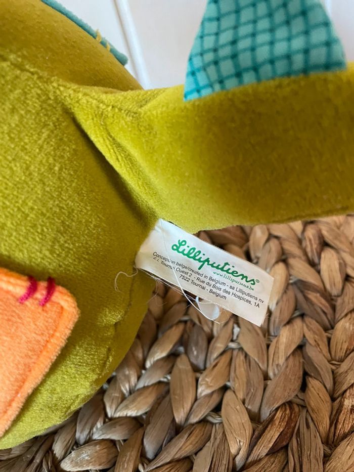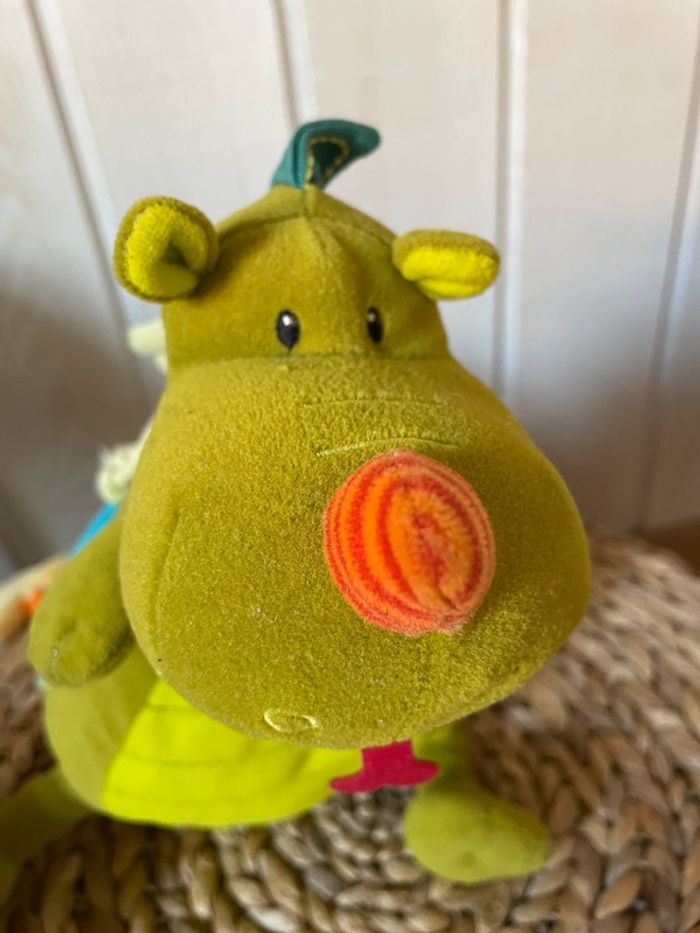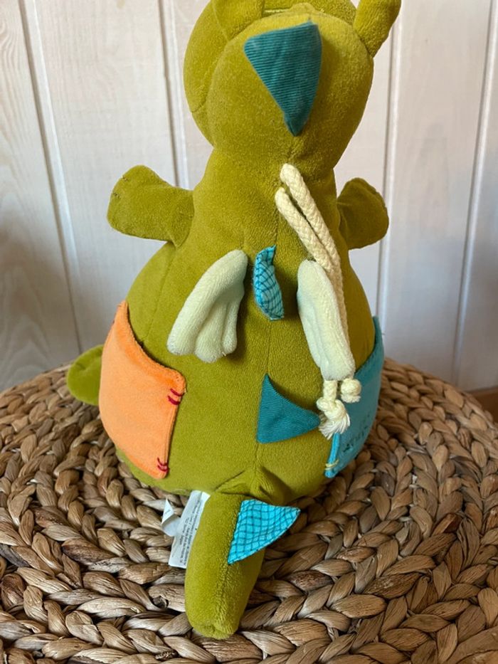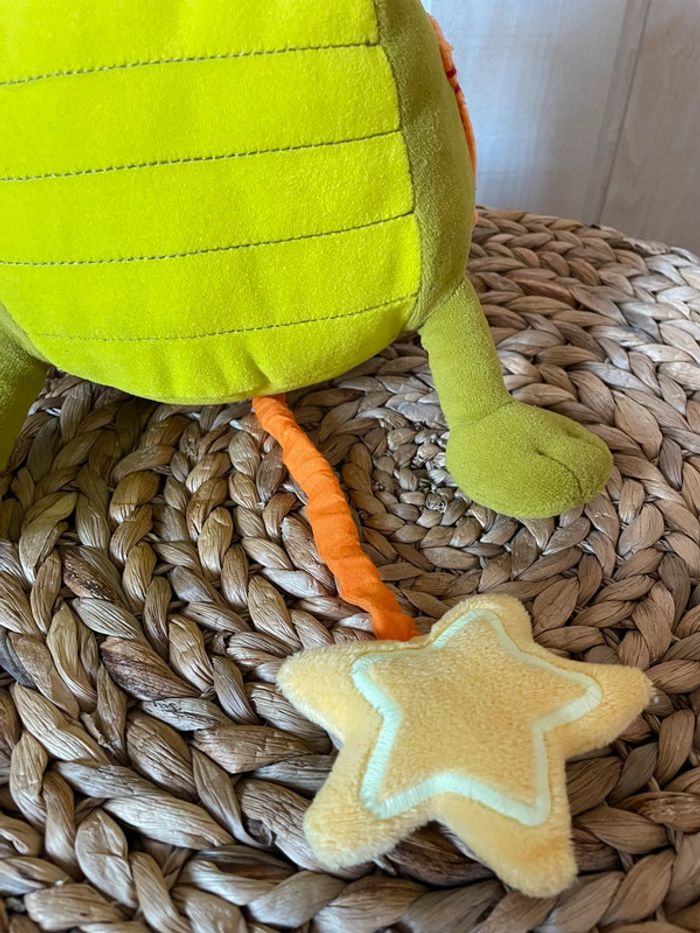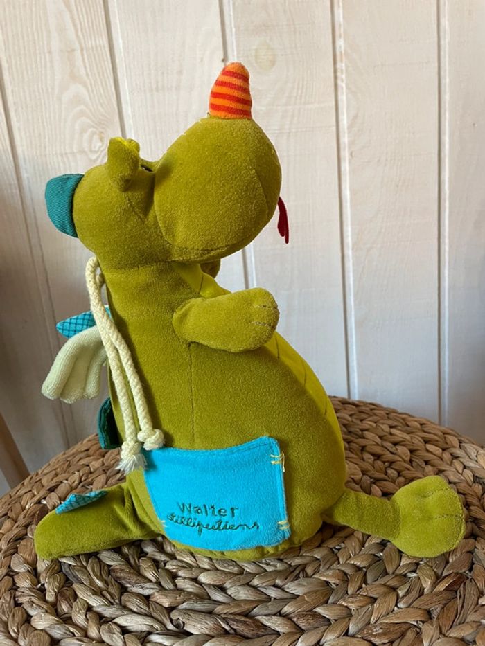 Peluche berceuse musicale « Mains » papier froissé, pied avec grelot Walter le dragon Marque Lilliputiens Étoile phosphorescente dans le noir Plus de lumière mais berceuse ok