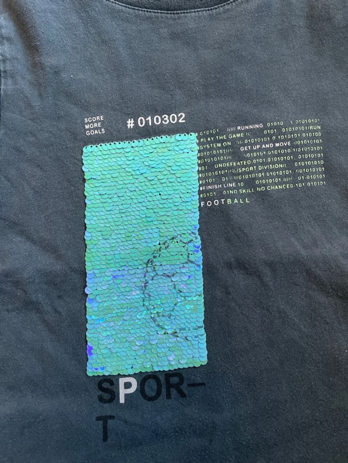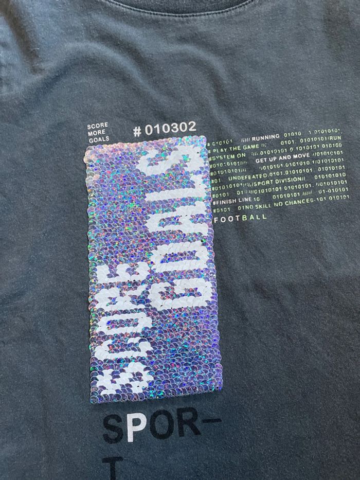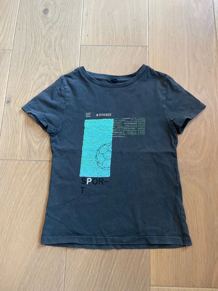 Tee-shirt manches courtes gris foncé à sequins réversibles Bien porté, coton un peu usé Marque Kiabi Taille 5 ans, 108-113cm #sdelandeG5a