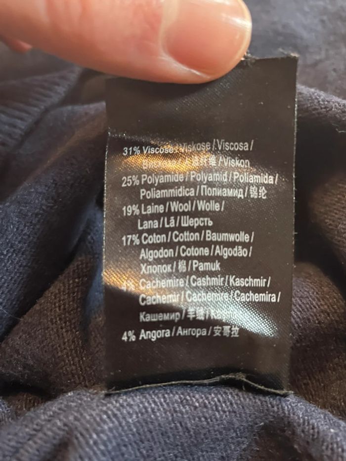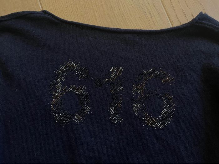 Pull fin mais chaud à col V bleu marine « 616 » en strass bronze/noir/argent au dos Coutures inversées Marque IKKS 616 Taille S Belle composition avec laine, cachemire et alpaga