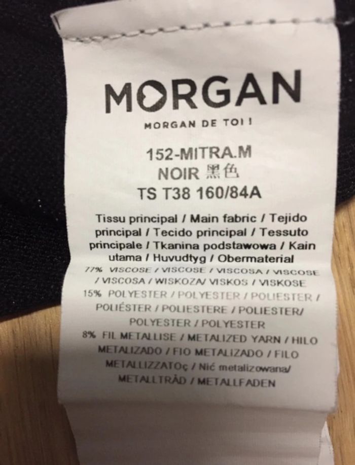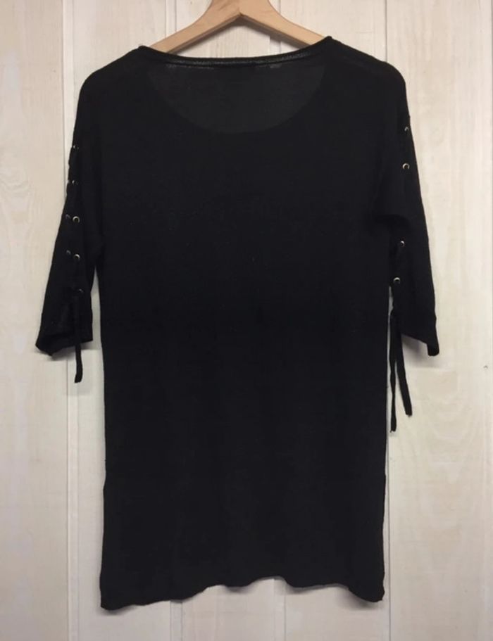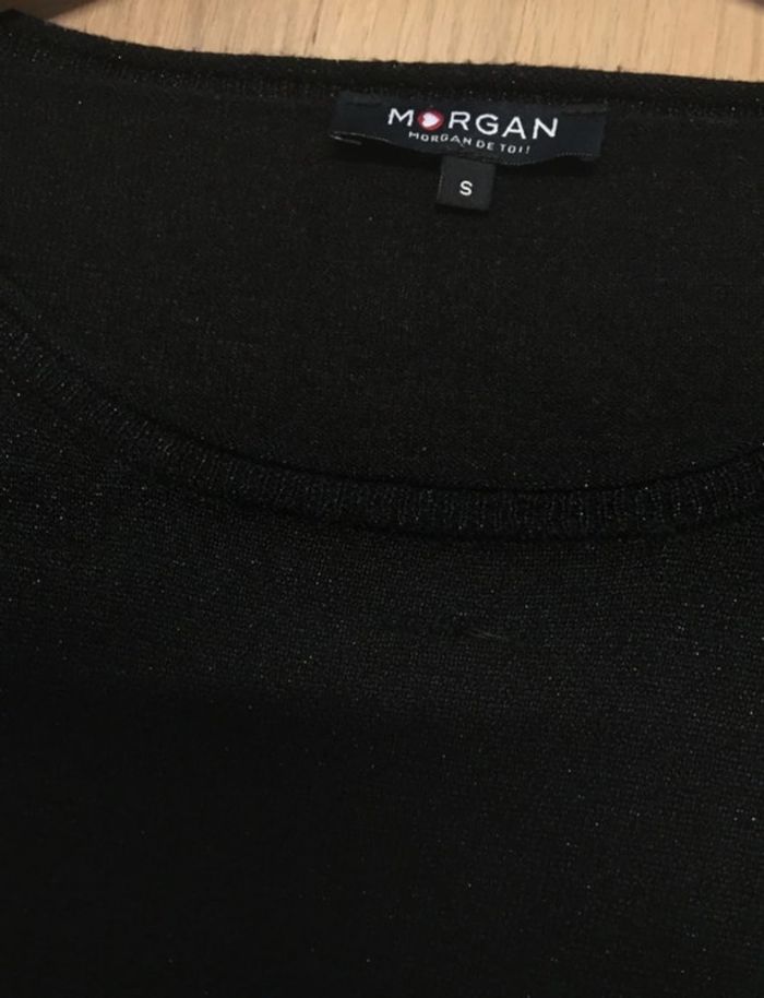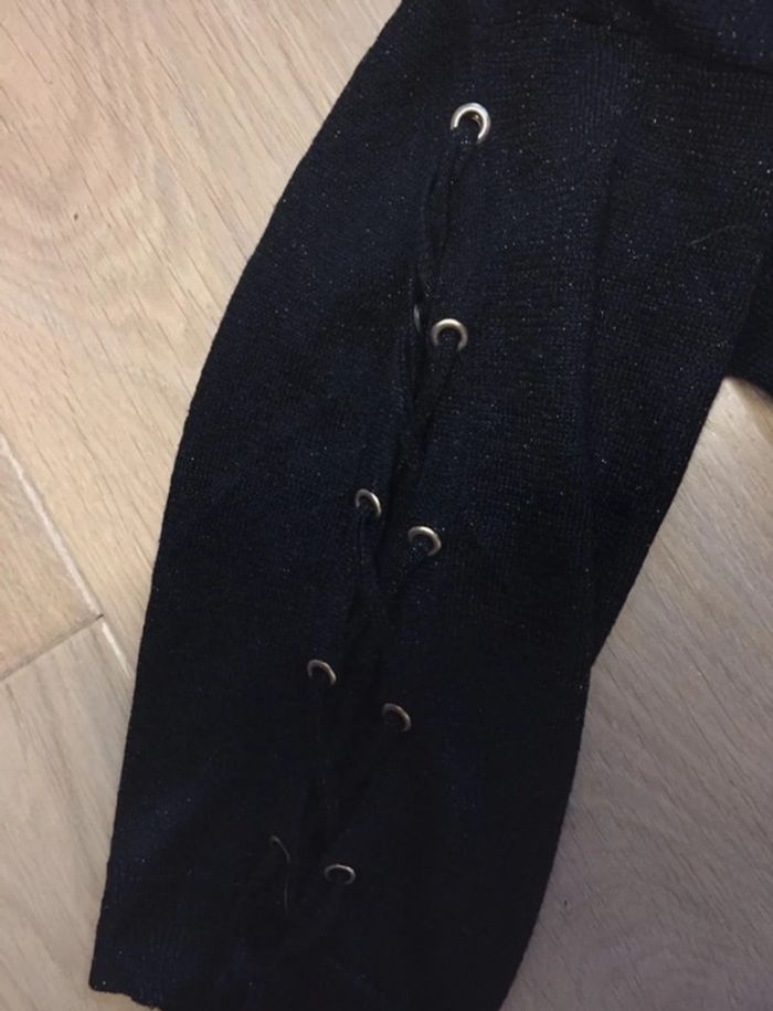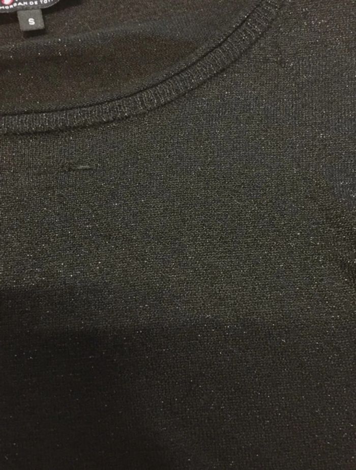 Haut mailles fines très fin noir pailleté, assez long Manches qui arrivent au niveau du coude à peu près Œillets avec cordon sur les manches Marque Morgan Taille S A noter : quelques fils tirés (voir photos) #sdelandeF36