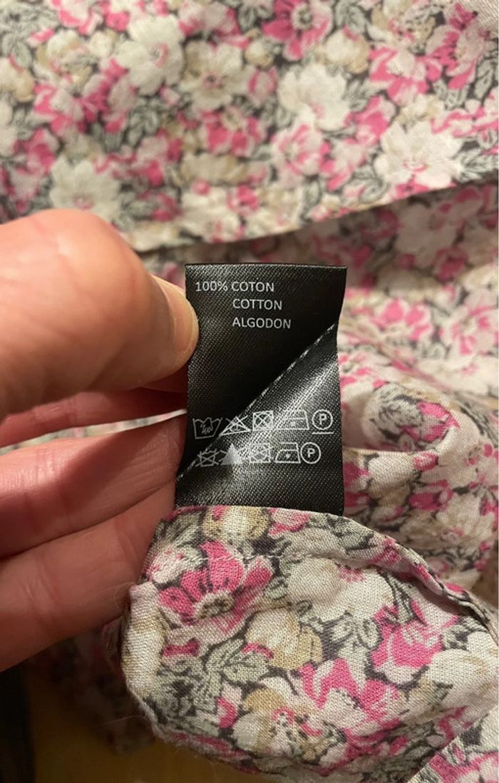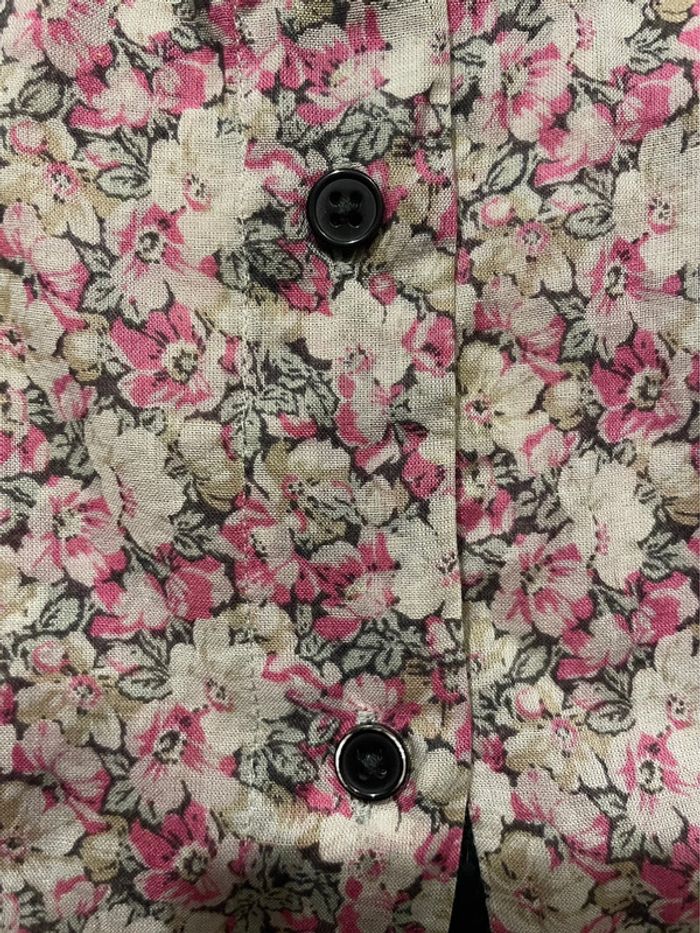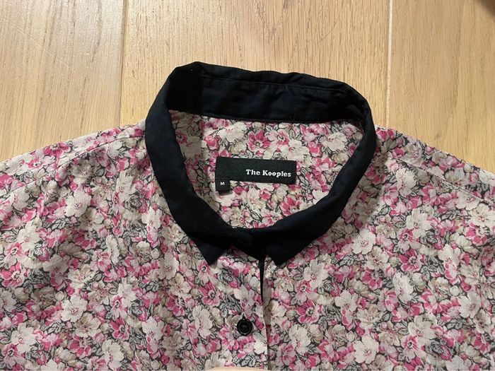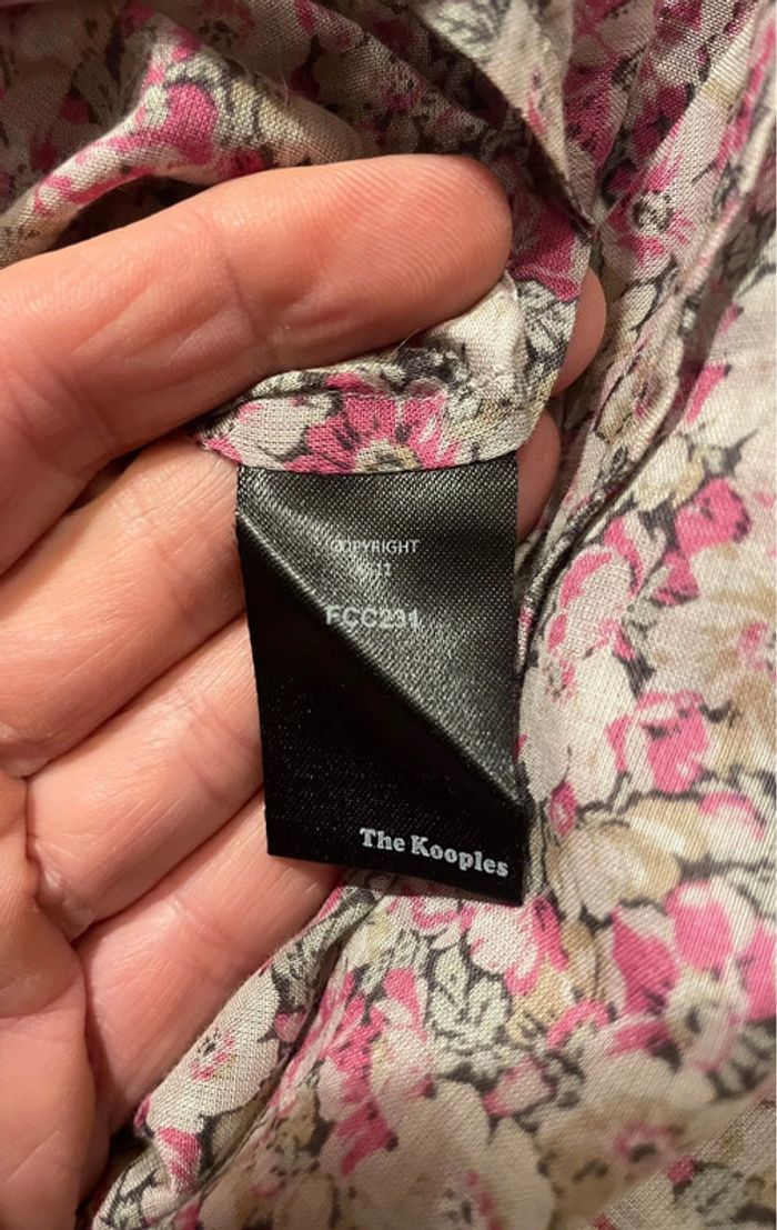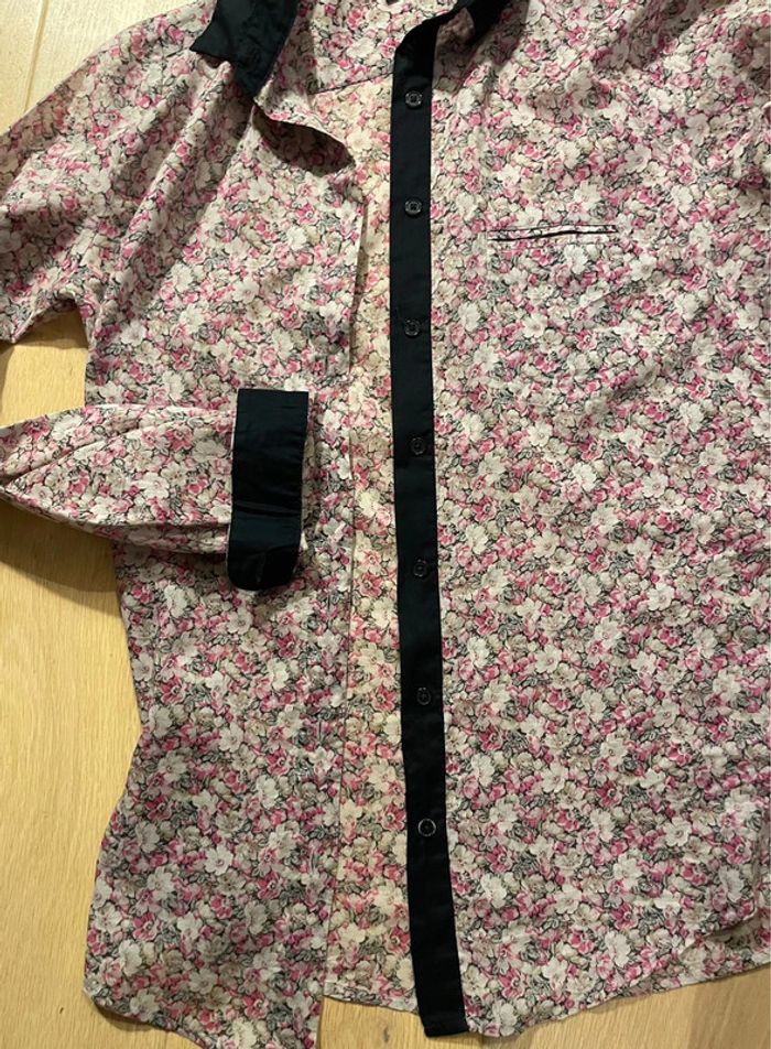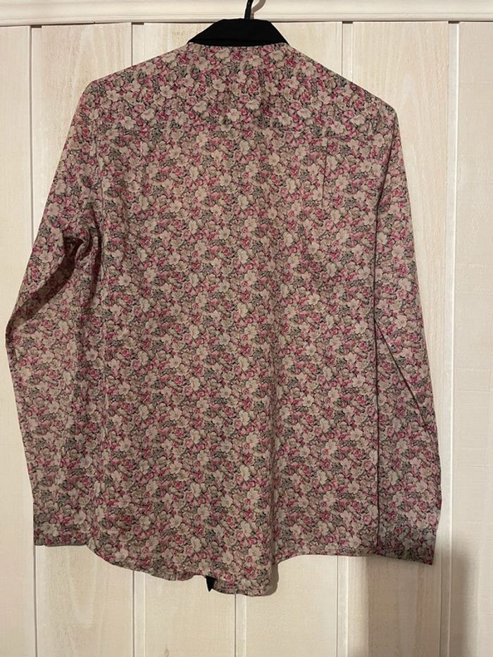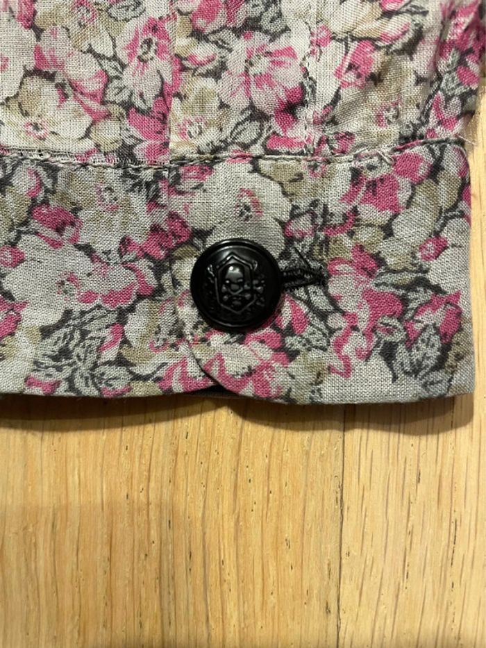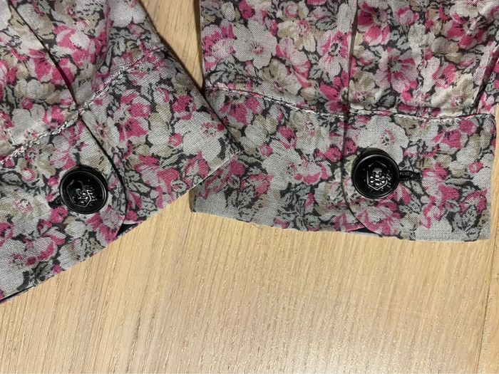Chemise pour femme, marque The Kooples En 100% coton, légère. Motif fleuri (rose/beige/vert clair) avec bande noir revers des manches et pattes de boutonnage. Bouton de fermeture des manches en métal avec jolie incrustation tête de mort. À noter un bouton (celui du bas) et ceux des manches un peu abîmés, manque de peinture (cf photo)
