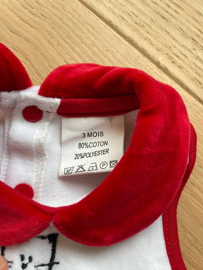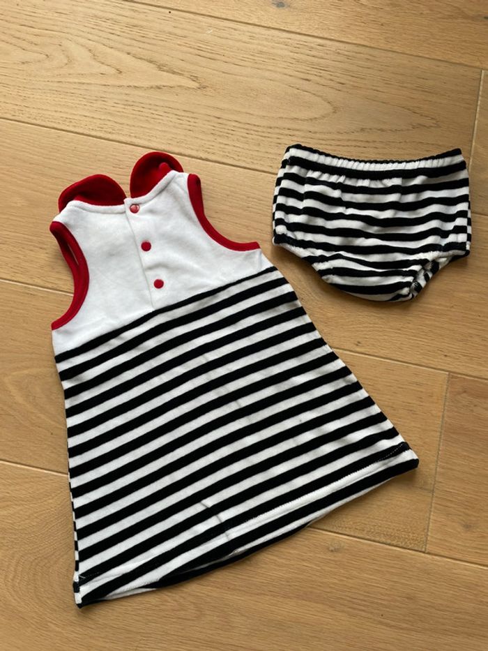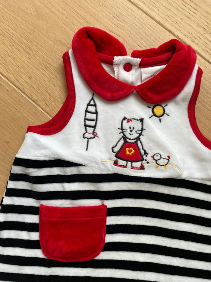 Robe sans manches avec col Claudine en velours tout doux Marin : blanche rayée marine, avec col rouge Bloomer/Culotte assortie Pas de marque Taille 3 mois #sdelandeF3m