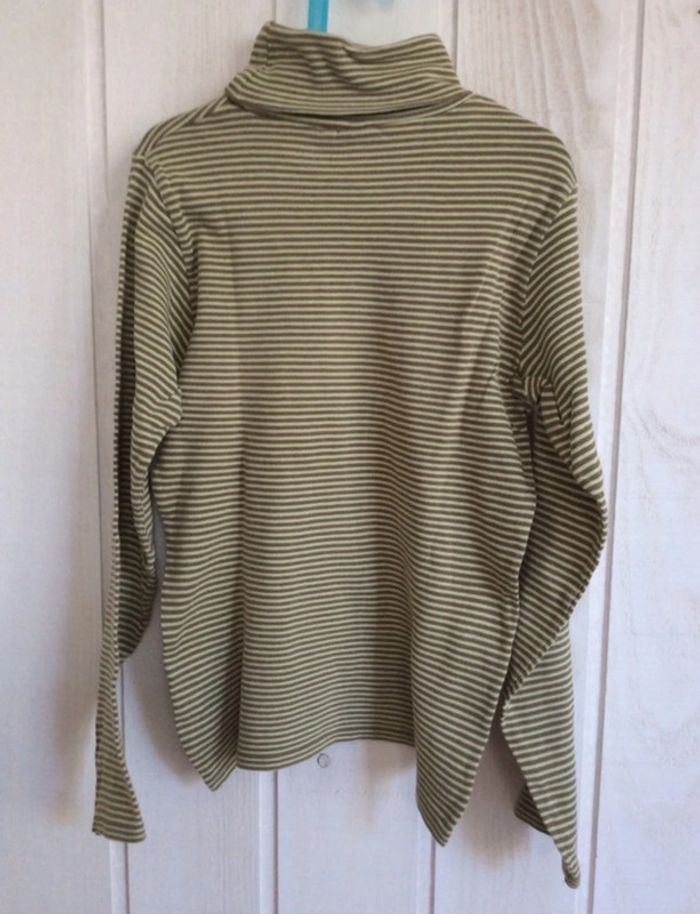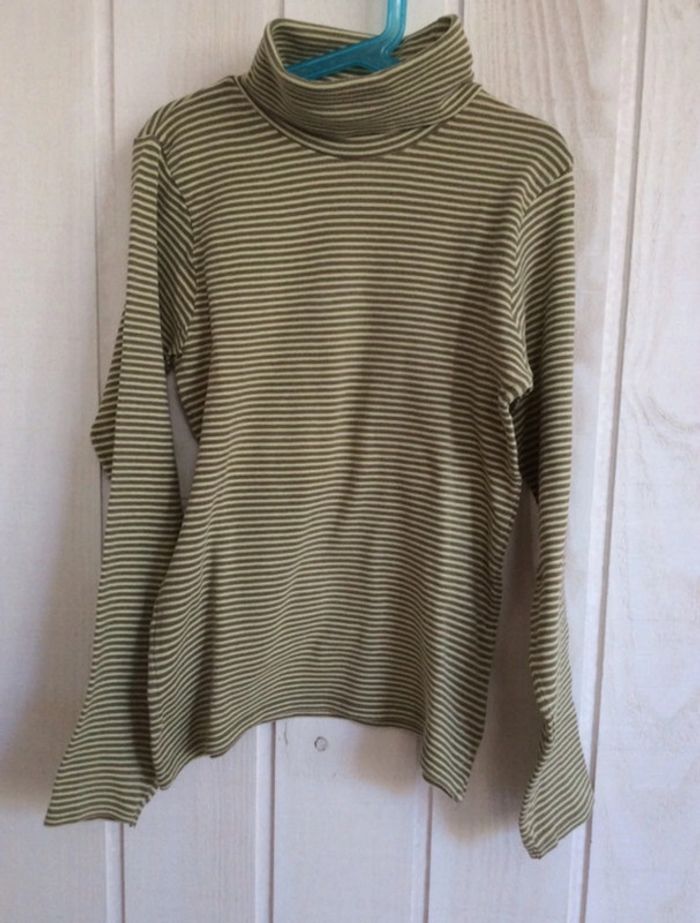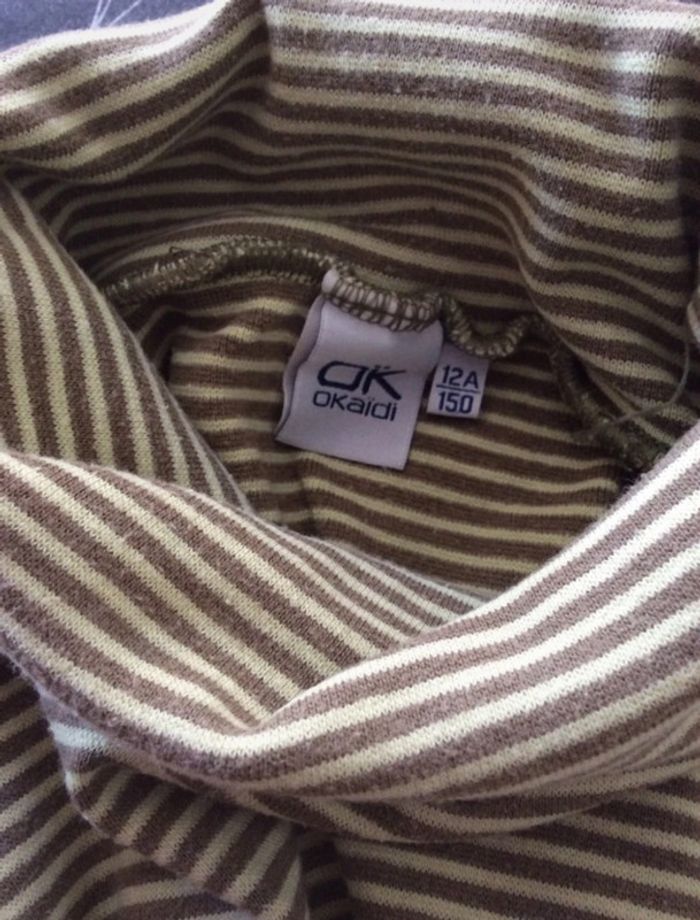 Sous-pull/Tee-shirt manches longues rayé vert/marron à col roulé Un peu peluché Marque Okaïdi Taille 12ans, 150cm 95% coton, 5% élasthanne #sdelandeG12a