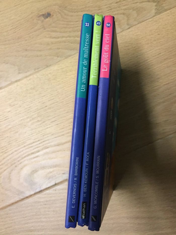 3 livres de la collection Demi-lune de chez Nathan : - N23 Un amour de maîtresse - N49 Terriblement vert ! - N58 Le goût du ciel Coins légèrement abîmés 2€ l’un, 5€ les 3