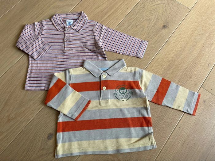 - 1 t-shirt rouge Grain de blé Neuf - 1 t-shirt marinière marine/blanc LOGG H&M - 1 polo rayé multicolore Petit Bateau - 1 polo rayé Tissaia - 1 t-shirt bleu ciel « Y’a pas plus beau que moi ! » sans marque