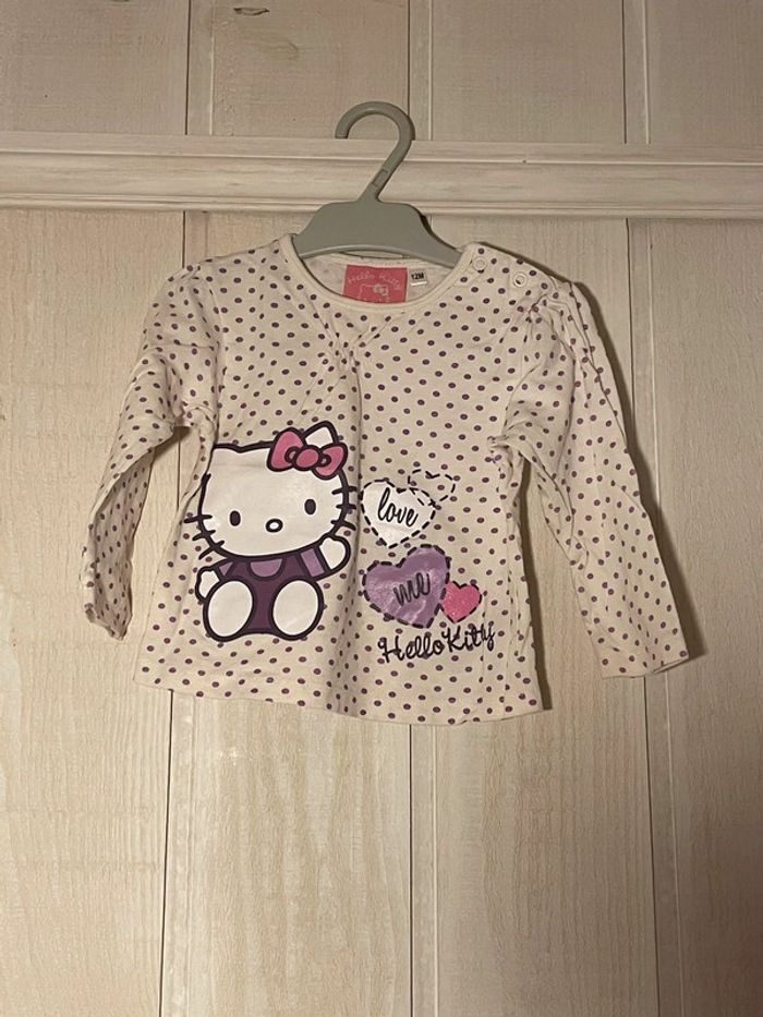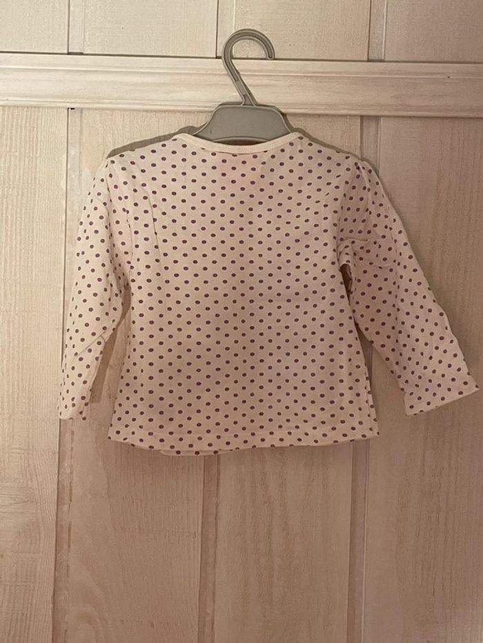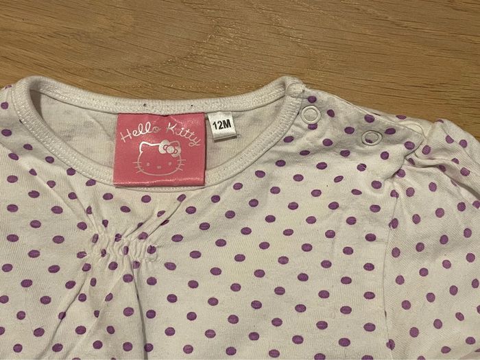Tee-shirt manches longues blanc à pois violets Petites fronces au col et aux épaules Marque Hello Kitty Taille 12 mois #sdelandeF12m