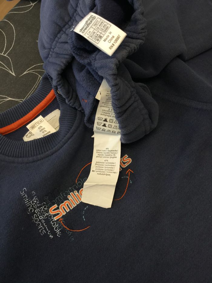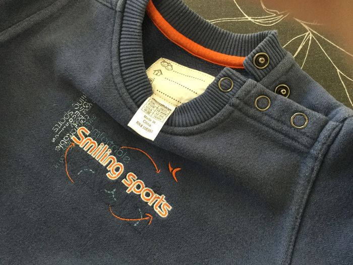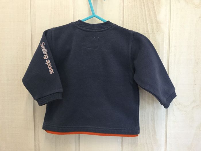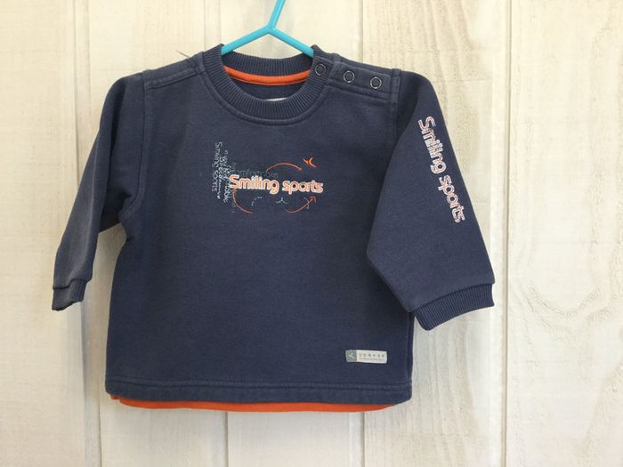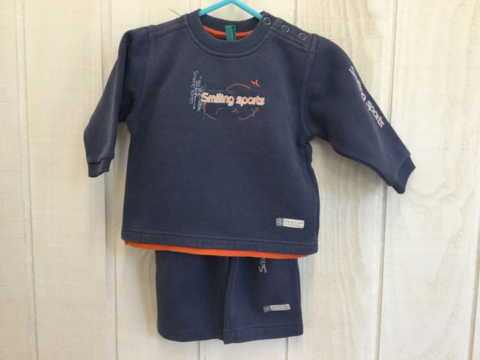Sweat de jogging molleton bleu marine, touches d’orange - resserré aux manches - impression de tee-shirt orange qui dépasse - 3 boutons pressions épaule gauche Pantalon de jogging molleton assorti - taille élastique - 2 poches devant Marque Domyos (Décathlon) Taille 12 mois/1 an, 70/77 cm #sdelandeG12m