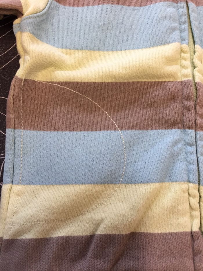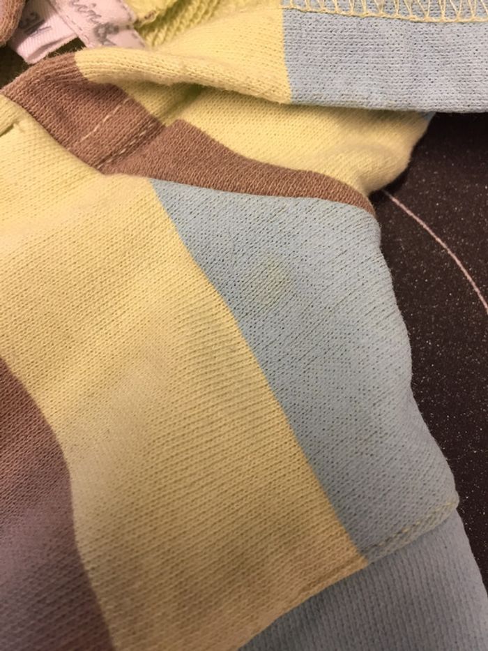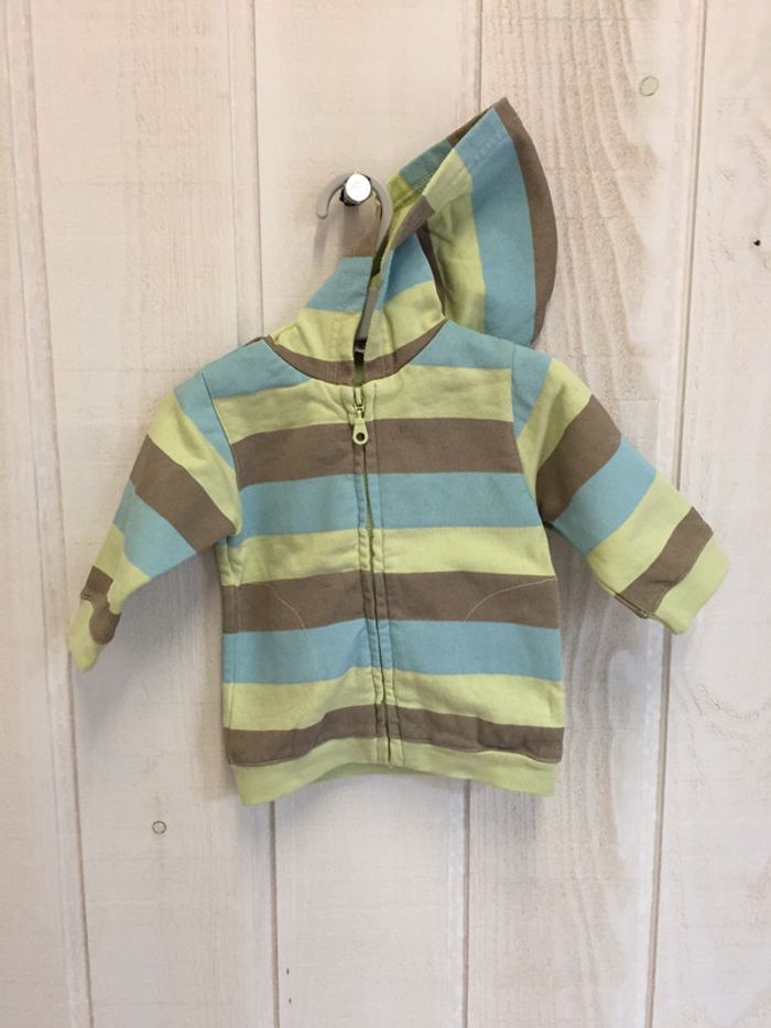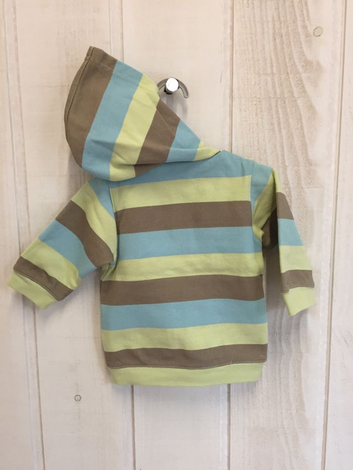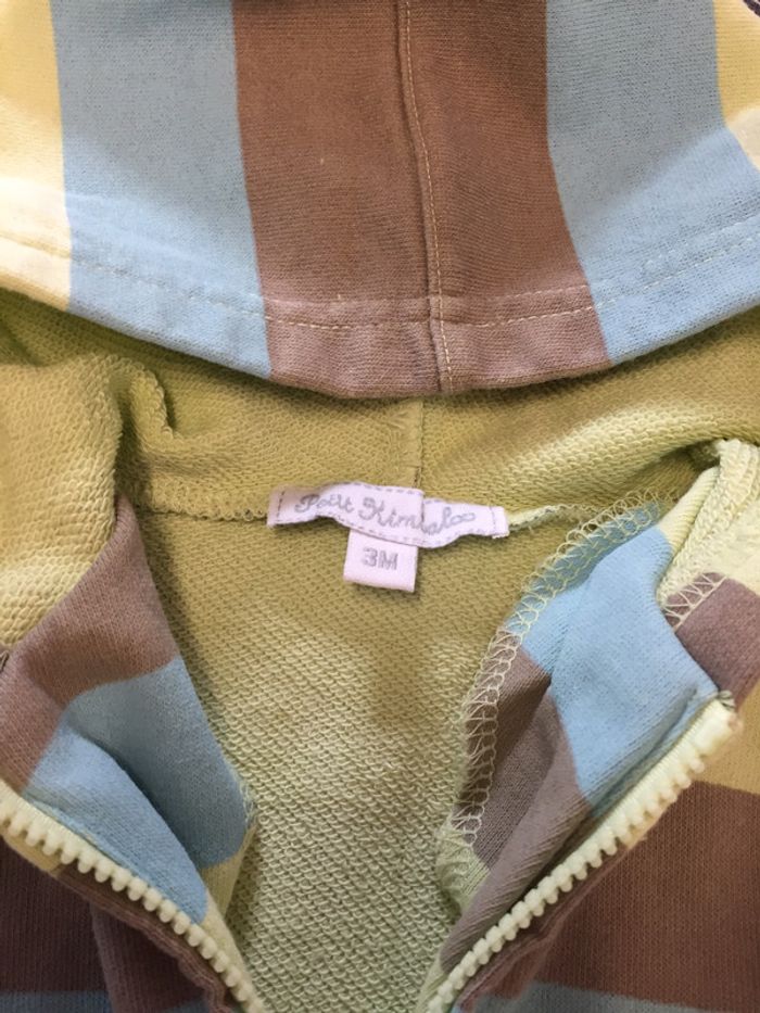 Gilet zippé à capuche rayé vert clair/bleu clair/marron Les « tâches » que l’on peut voir n’en sont pas c’est en fait le vert du dessous qui ressort ! Marque Petit Kimbaloo Taille 3mois #sdelandeG3m