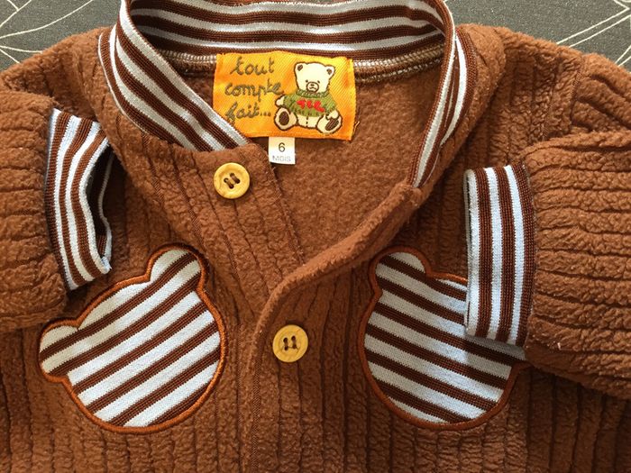 Pyjama en polaire marron avec col et poignets rayés bleu et marron, motifs têtes d’ours et inscription « tout compte fait... » en bleu Boutons tout du long devant et pressions à l’entrejambe Marque Tout compte fait... Taille 6 mois #sdelandeG6m