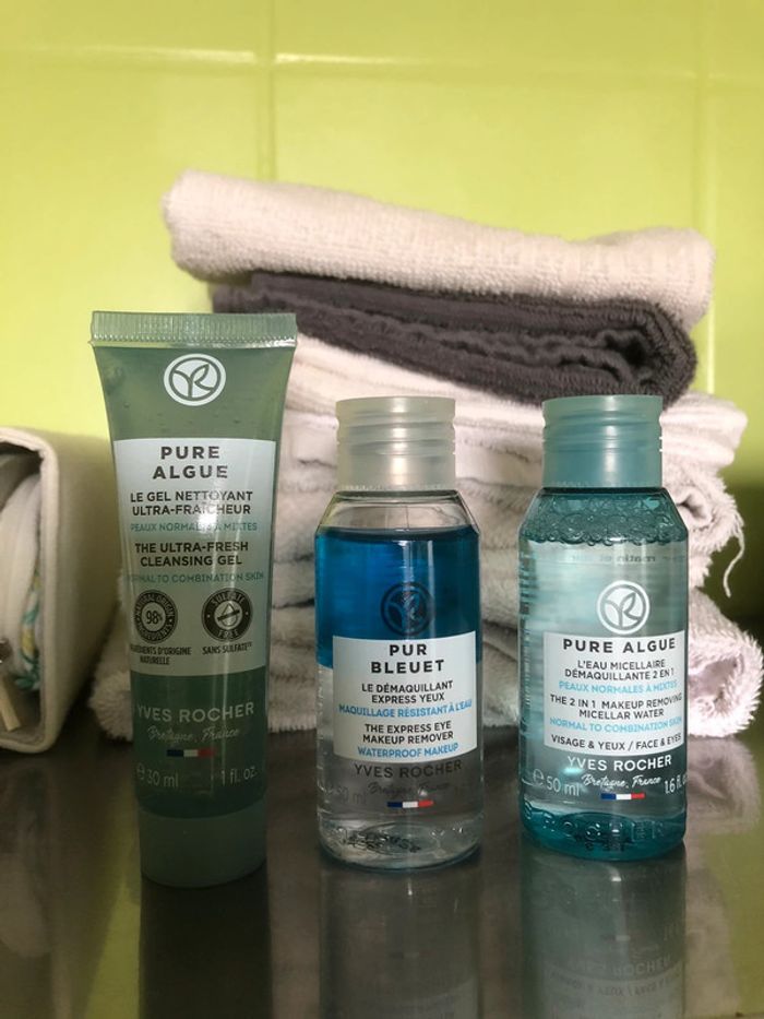 Idéal pour les vacances ! Ça prend peu de place dans le vanity 😉 Un gel nettoyant ultra-faîcheur - 30ml Une eau micellaire démaquillante 2 en 1 - 50ml Et un démaquillant express yeux 50ml Neuf non utilisé / mars 2026