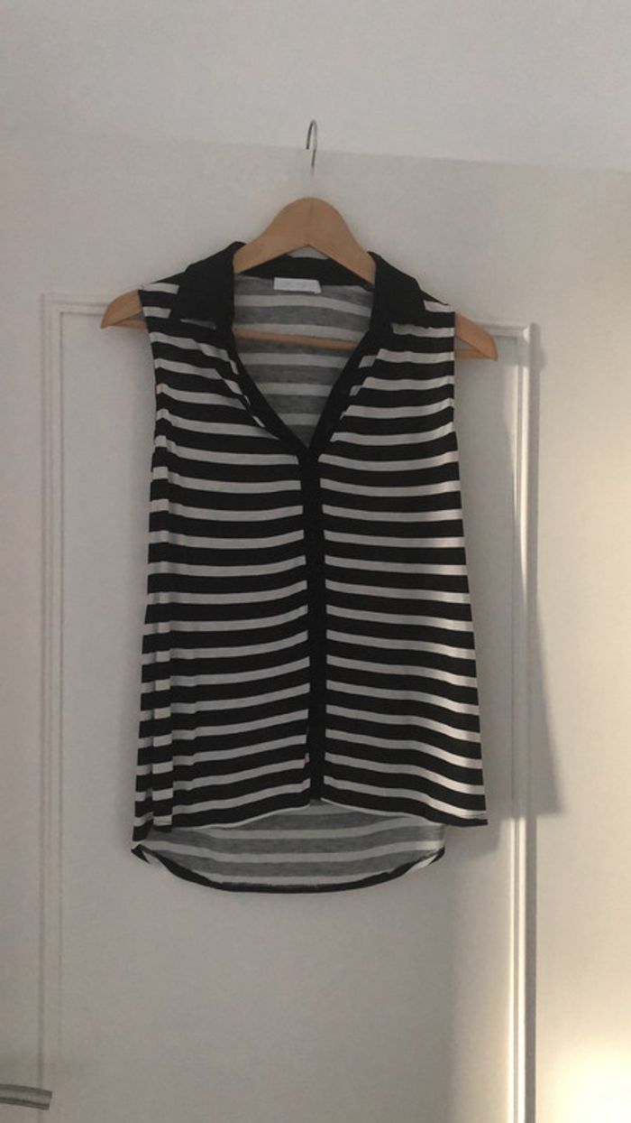 Joli top rayé sans manches avec col et boutons tissus fin et léger jamais porté mais présente un défaut vu trop tard après achat sur internet, tissus avec petit trou comme de l’usure et je n’ai pas de talent de couturière 😕 #drey2406vetementsfemmetaille36