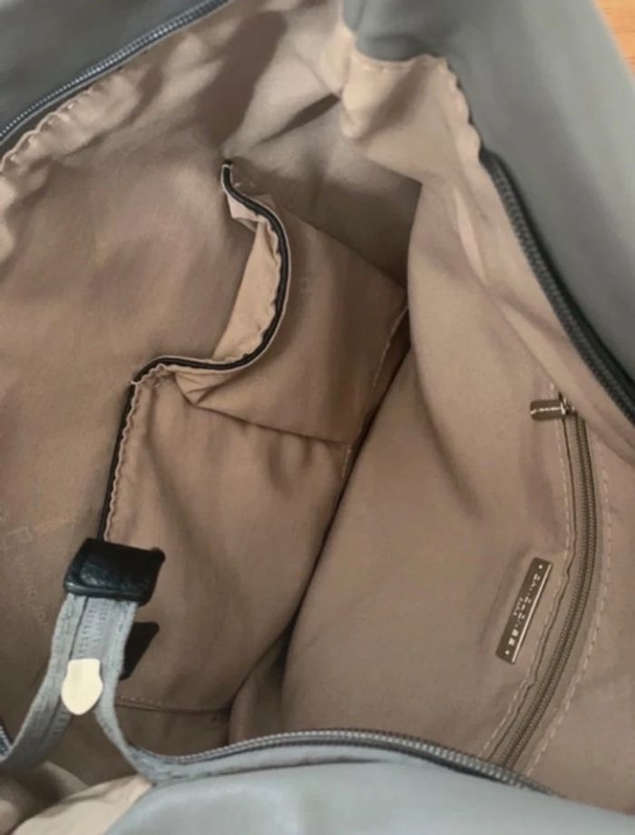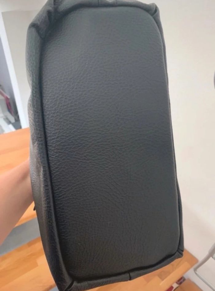 sac en similicuir porté main et fermé par zipp effet bi matière grainé en noir et lisse en gris une poche arrière zippée une poche intérieur zippé, une poche ouverte et une poche pour mobile petit porte clé dimensions hors anse:35x42cm profondeur:29cm largeur fond:16cm très peu servi comme neuf #mejugesac