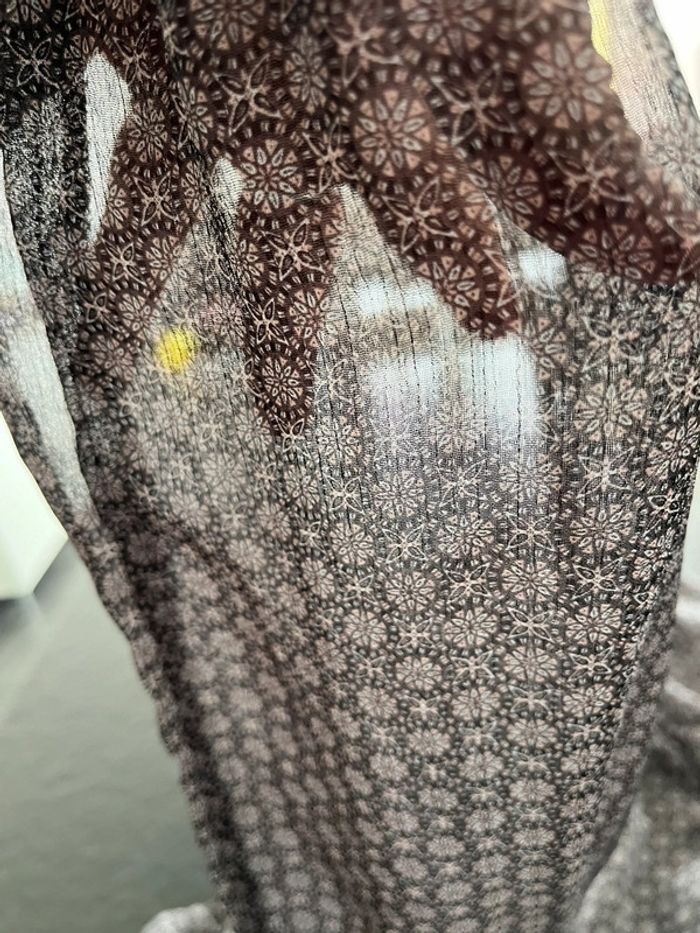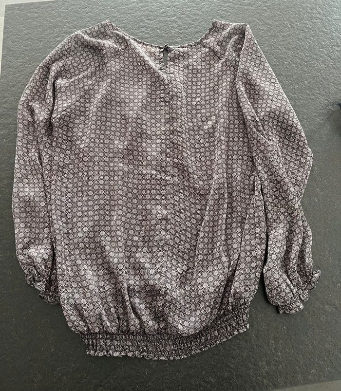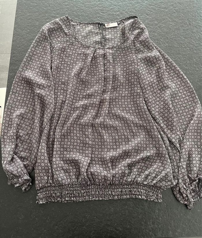 Fermée par 1 bouton à l’arrière Transparente a motif Bas et manches resserrées par élastique Aisselle à aisselle à plat: 57 cm Excellent état #mejugetaille46