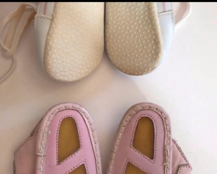 une paire de baskets en toile rose ( quelques tâches jaunies sur lacets voir photo) marque canari baby une paire de sandales en cuir avec semelle lanière élastique marque andré (Carton3) #mejugechaussurespointure18 #mejugechaussurespointure19