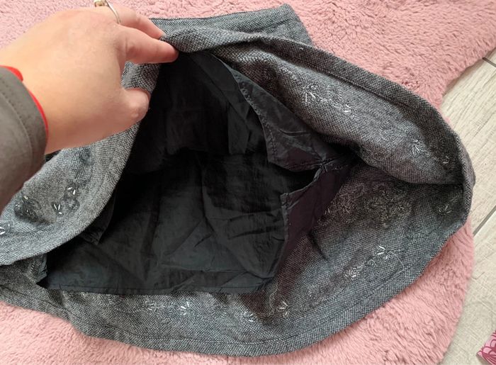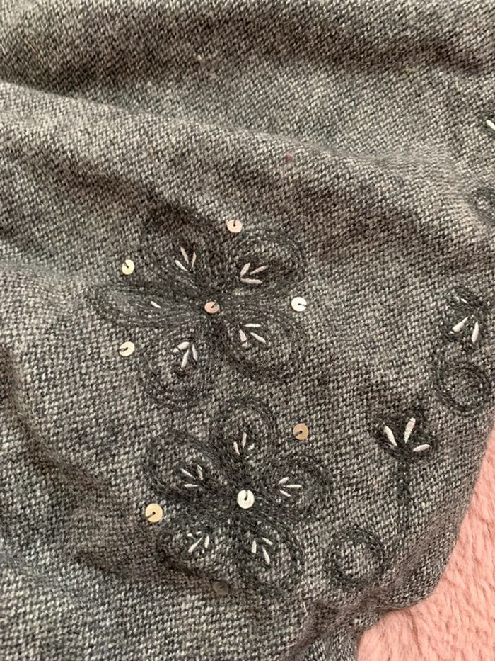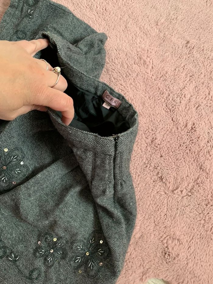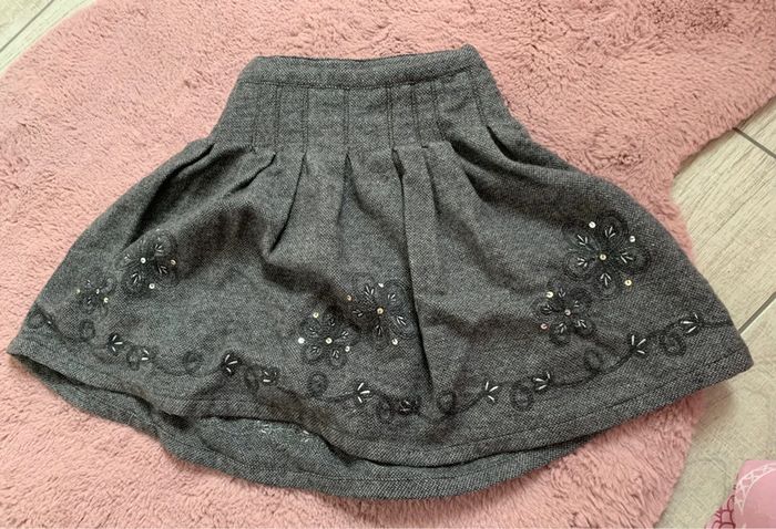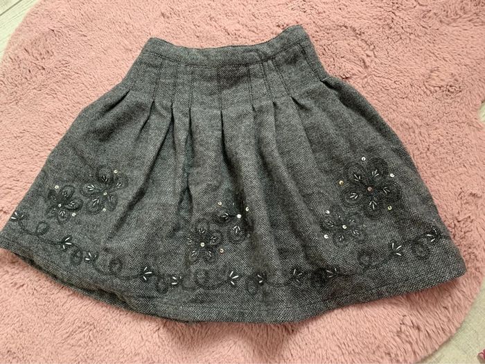 Jupe grise doublée Fermée par zipp et petit crochet Motif fleus avec sequins Excellent état 60% laine 30%viscose 10% polyester L496 #mejuge8ans