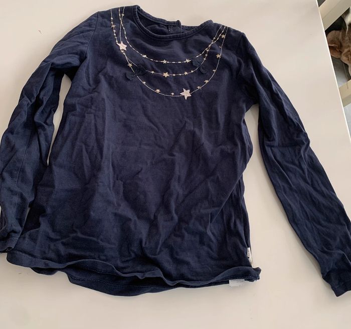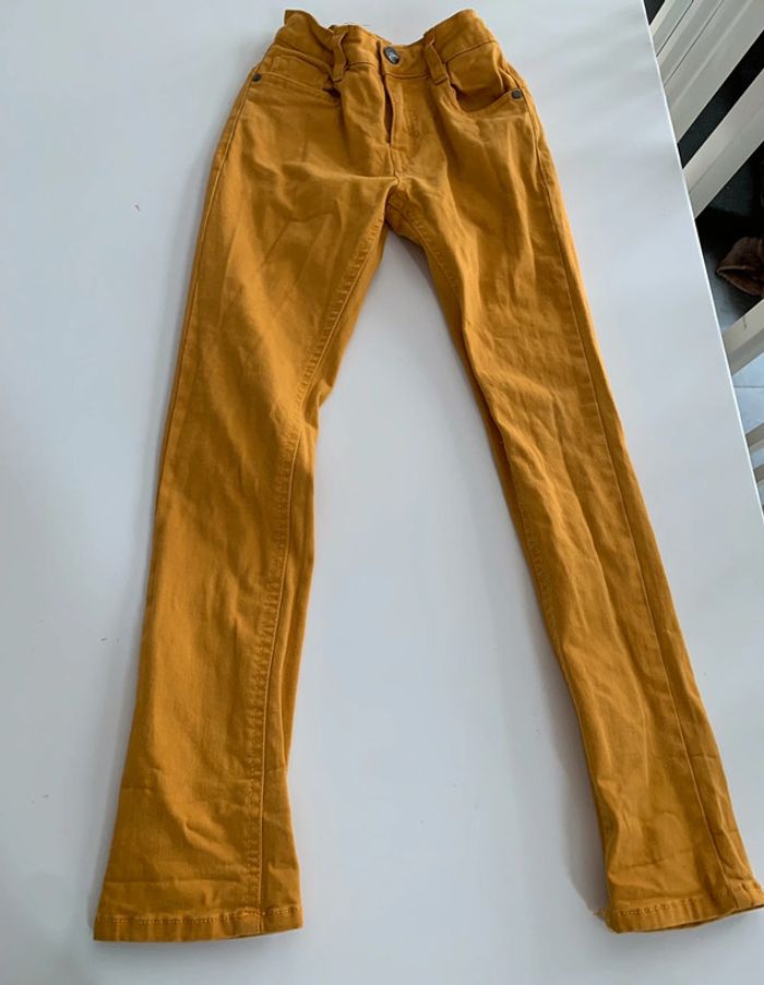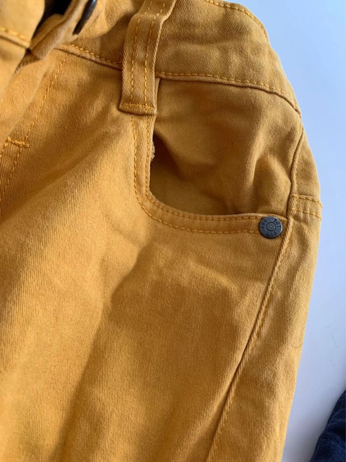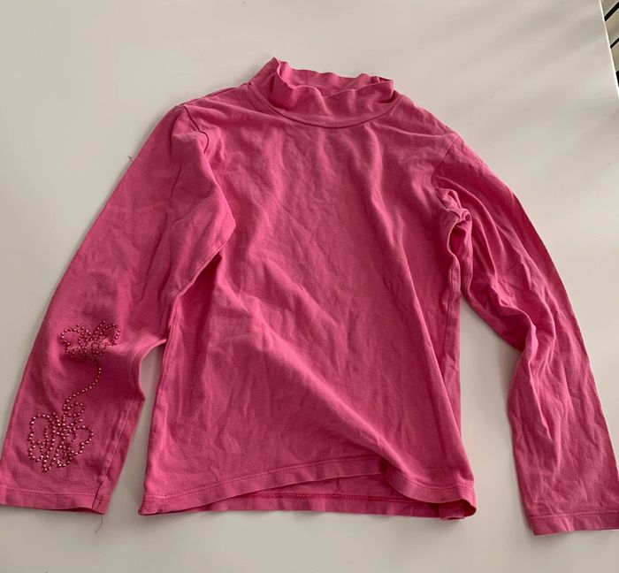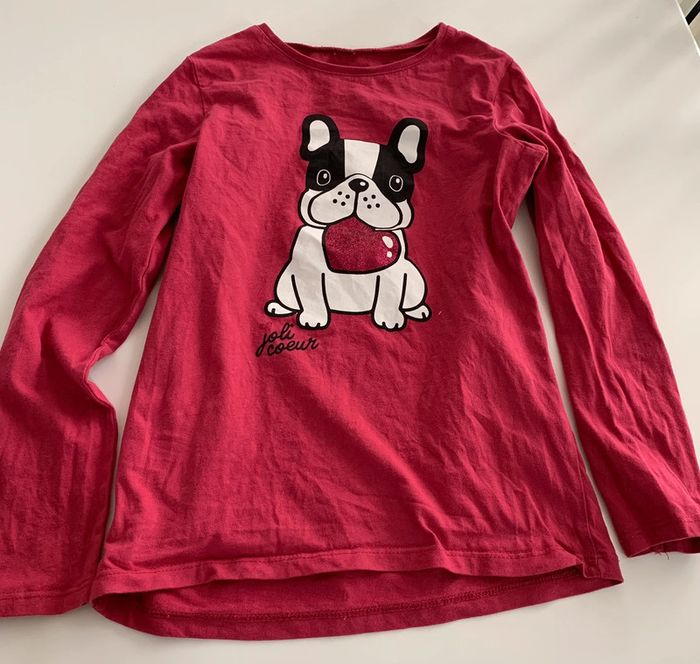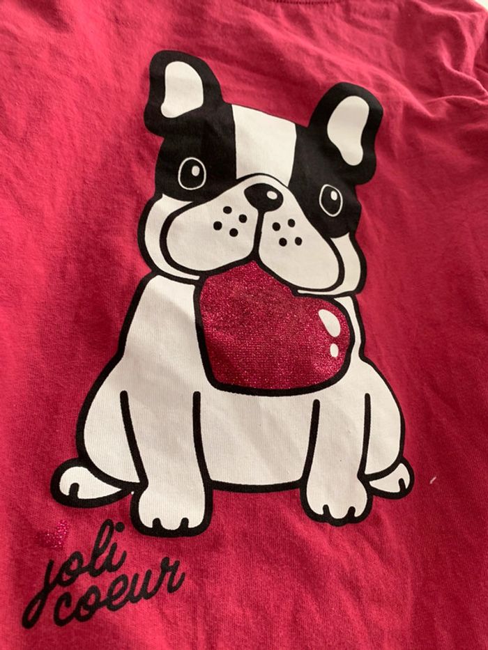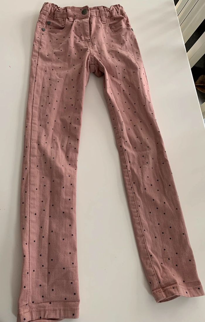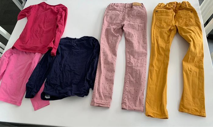 Lot comprenant: - 1 pantalon rose motif etoiles noir fermé par zipp et pression Du Pareil Au Même - 1 pantalon jaune moutarde fermé par zipp et agrafe Orchestra - 1 t-shirt manches longues arine motif collier fermé par pressions à l’arrière Sergent Major - 1 t-shirt rose petit col avec strass sur bras Orchestra - 1 t-shirt bordeaux motif chien avec coeur paillettes In extenso L494 #mejuge8ans