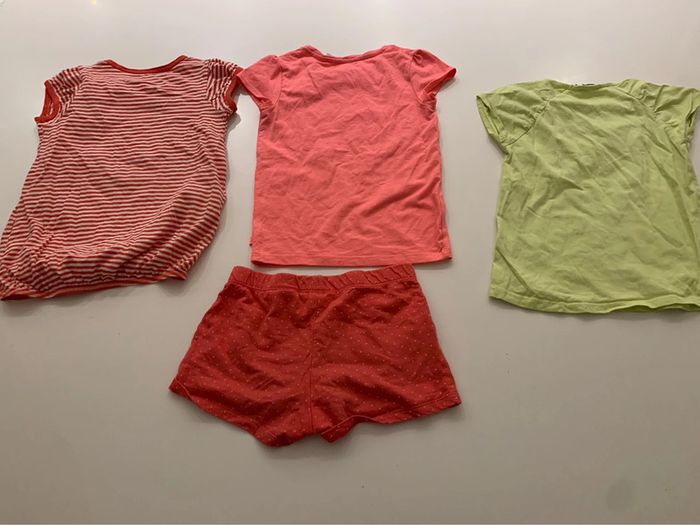 Lot comprenant : - 1 short H&M 6/7ans - 1 t-shirt corail Okaïdi - 1 t-shirt jaune TAO - 1 t-shirt rayé Okaïdi L488 #mejuge6ans