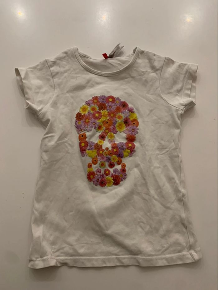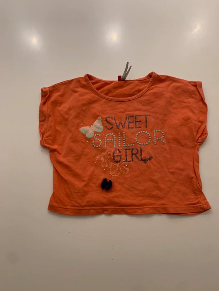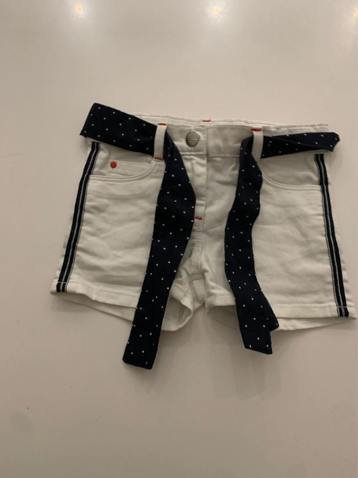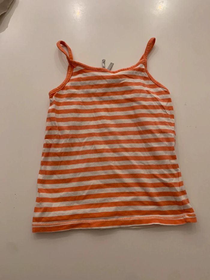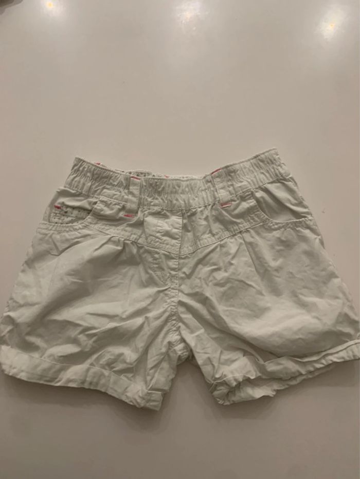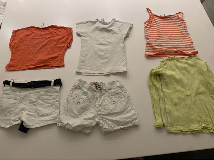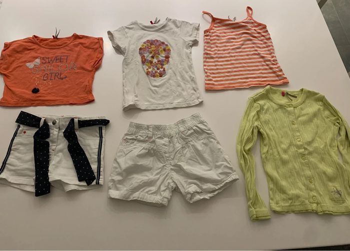 Lot comprenant : - 1 short blanc avec ceinture tissu - 1 short blanc - 1 t-shirt orang - 1 débardeur à rayure - 1 gilet en coton jaune - 1 t-shirt blanc motif tête de mort fleurs L483 #mejuge6ans