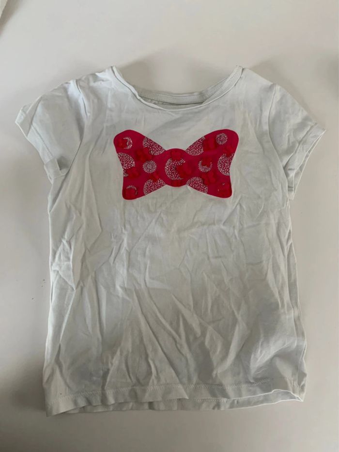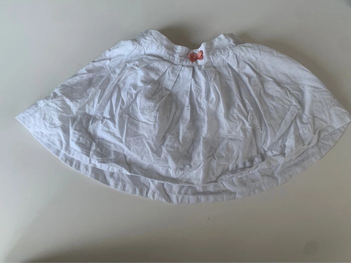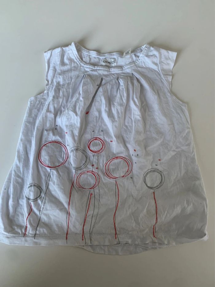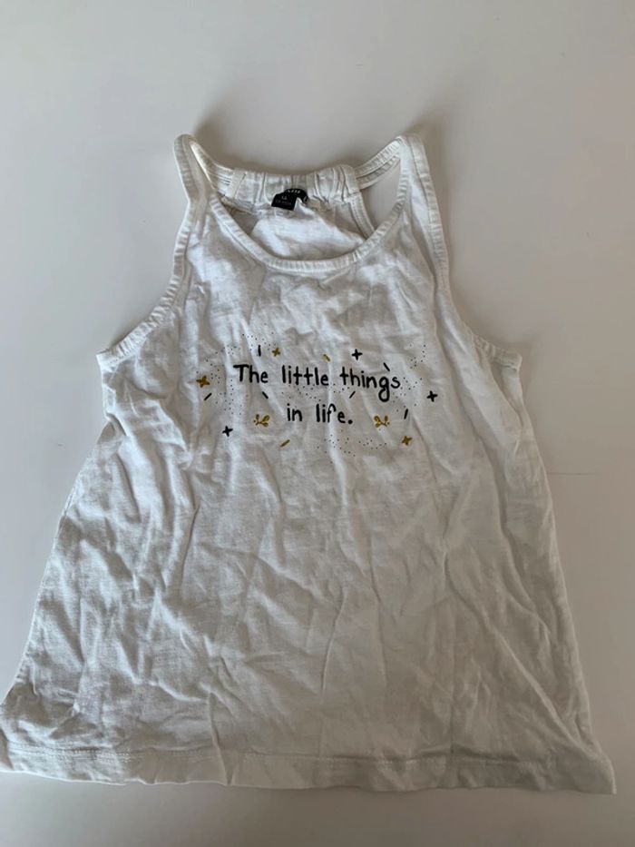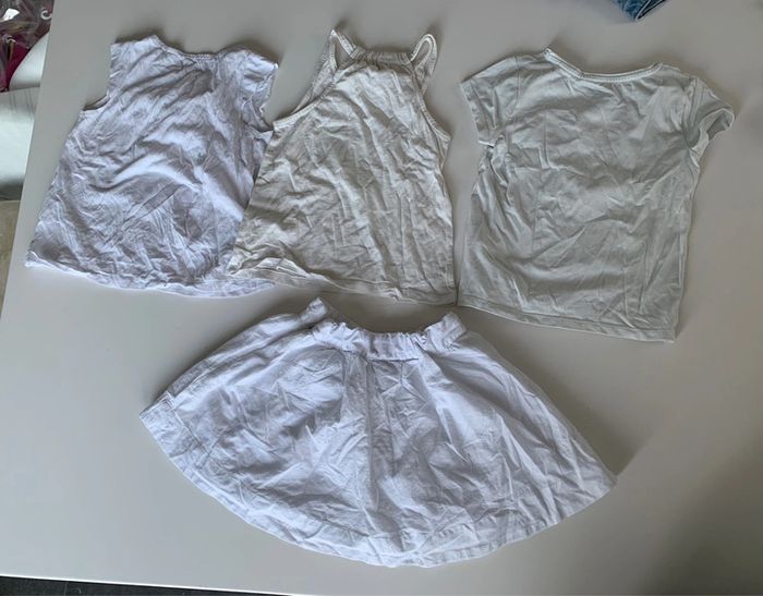 Lot comprenant : - 1 jupe entièrement doublée blanche avec fil argent sergent major - 1 t-shirt manches courtes avec noeud orchestra - 1 débardeur crème avec écriture kiabi - 1t-shirt blanc avec motif fleurs Okaïdi L440 #mejuge5ans