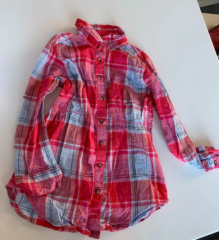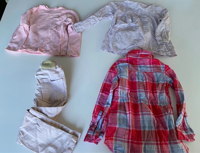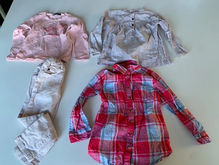 Lot comprenant: - 1 jeans slim rose absorba - 1 pull rose motif papillon in extenso - 1 blouse chemise à carreaux LOGG - 1 blouse TAO L306 #mejuge4ans