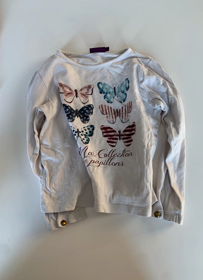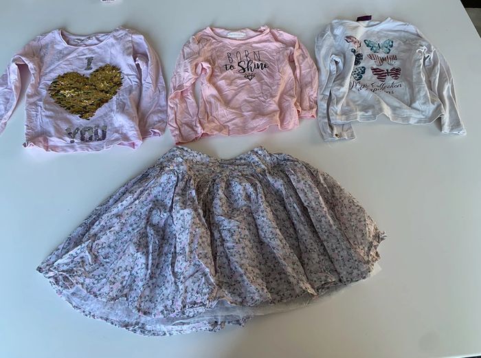 Lot comprenant: - 1 jupe b-unity - 1 t-shirt manches longues rose motif facette orchestra - 1 t-shirt manches longues blanc motifs papillons sergent-major - 1 t-shirt manches longues rose avec inscriptionnoir in extenso L305 #mejuge4ans
