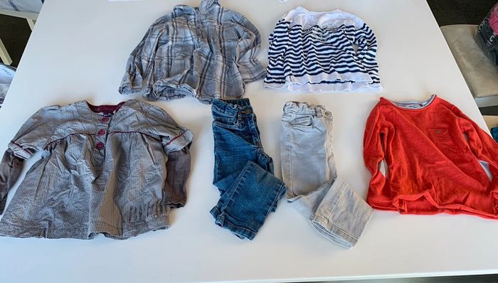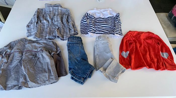 Lot comprenant: - 1 slim gris clair petit bateau - 1 slim jeans DPAM - 1 pull a rayure motif fleurs verbaudet - 1 pull rouge gris okaidi - 1 blousd grise à carreaux TEX - 1 blouse blouse grise petit motif sergent-major L302 #mejuge4ans