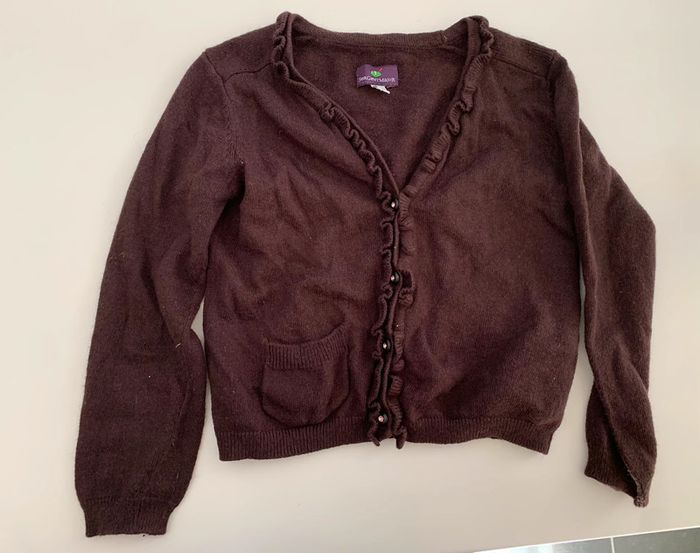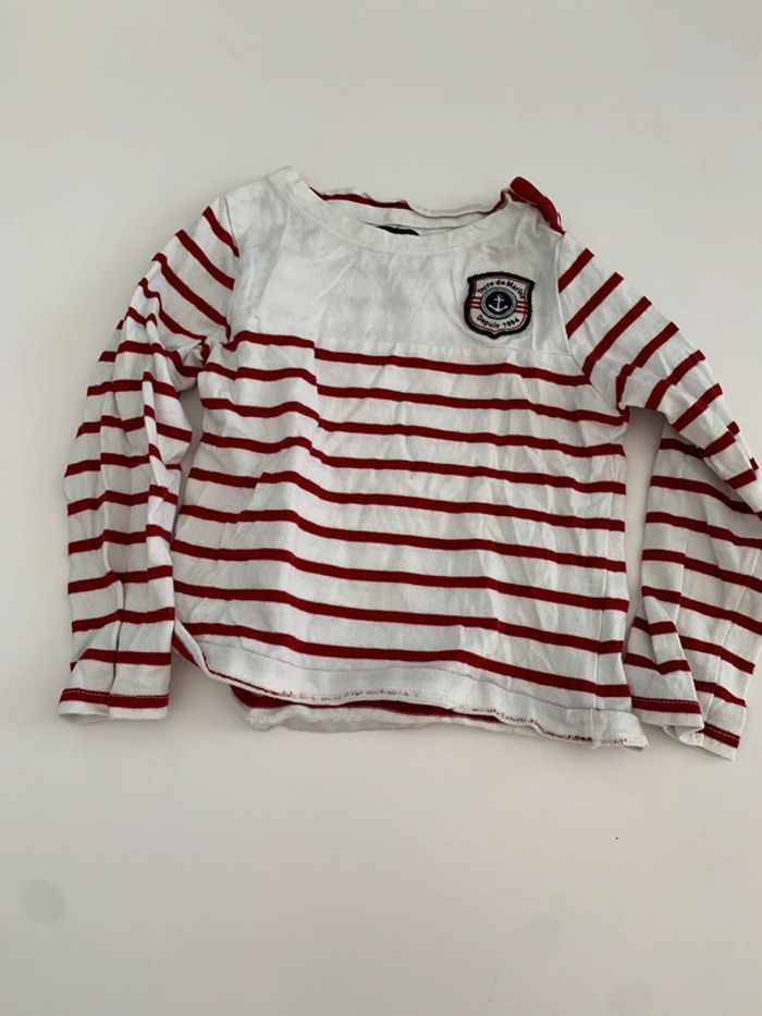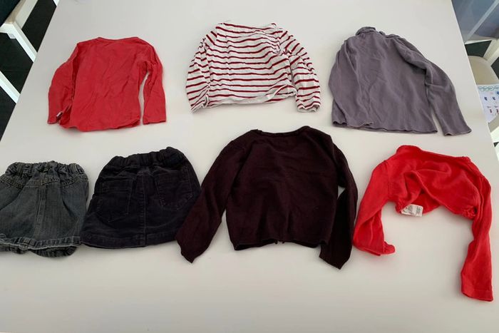 Lot comprenant: - 1 gilet aubergine sergent-major - 1 boléro rouge - 1 jupe en velour Okaïdi - 1 jupe en jeans - 1 t- shirt manches longues col claudine sergent-major (manque 1 bouton) - 1 t-shirt manches longues a rayure terre de marins - 1 t-shirt manches longues rouge okaidi L224 #mejuge36mois
