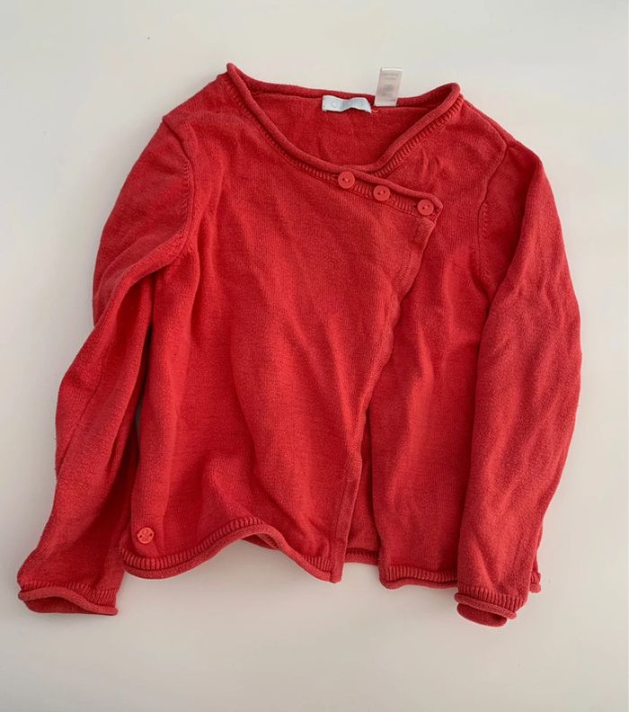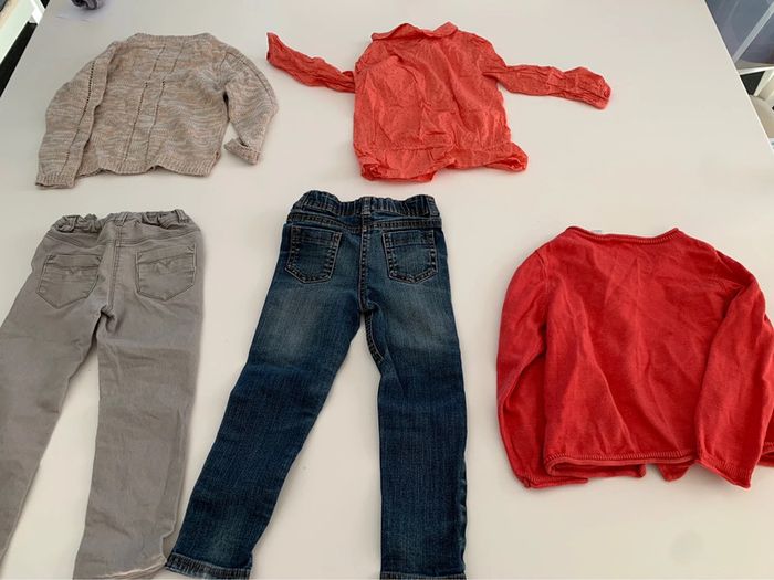 Lot comprenant: - 1 pull complice - 1 gilet rouge orangé obaïbi - 1 jeans tape à l’oeil - 1 pantalon geis tape à l’oeil - 1 blouse orangé du pareil au même - 1 t-shirt manches longues gris okaidi L222 #mejuge36mois
