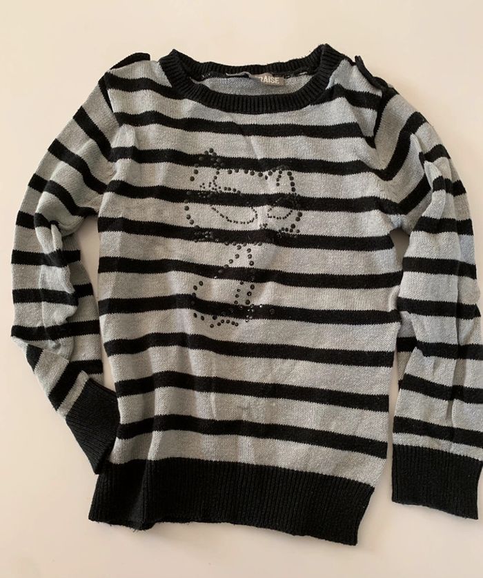 Lot comprenant: - 1 salopette en jeans kidkanaï - 1 t-shirt/pull léger coton à rayures rouge motif lapin sergent-major - 1 pull marron NKY - 1 pull a rayure noir et grise motif chat vynil fraise - 1 sweat à rayure motif chat noeud sucre d’orge L290 #mejuge4ans