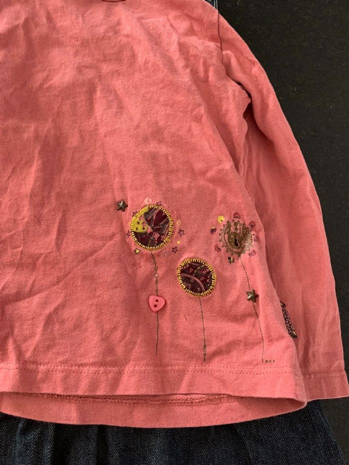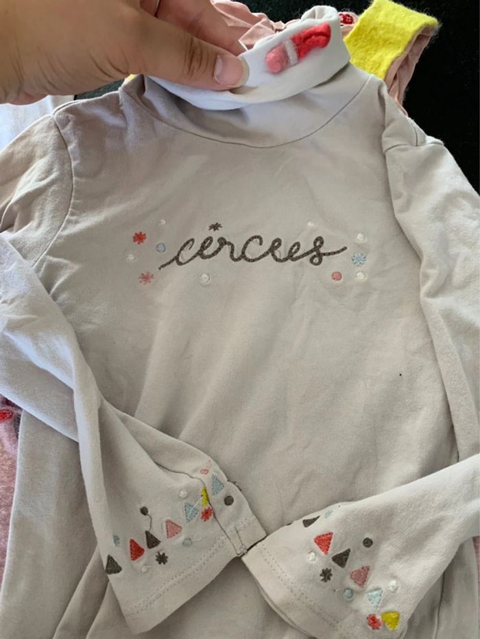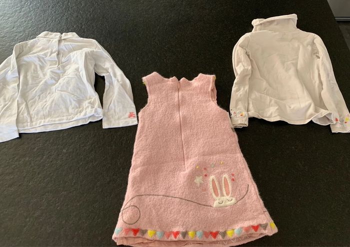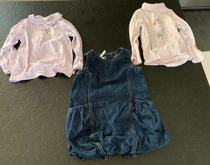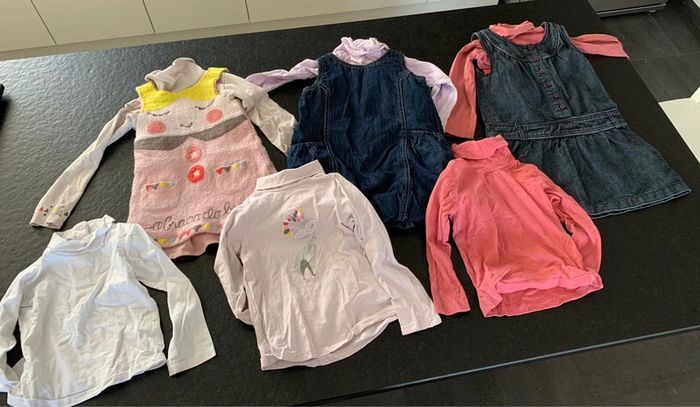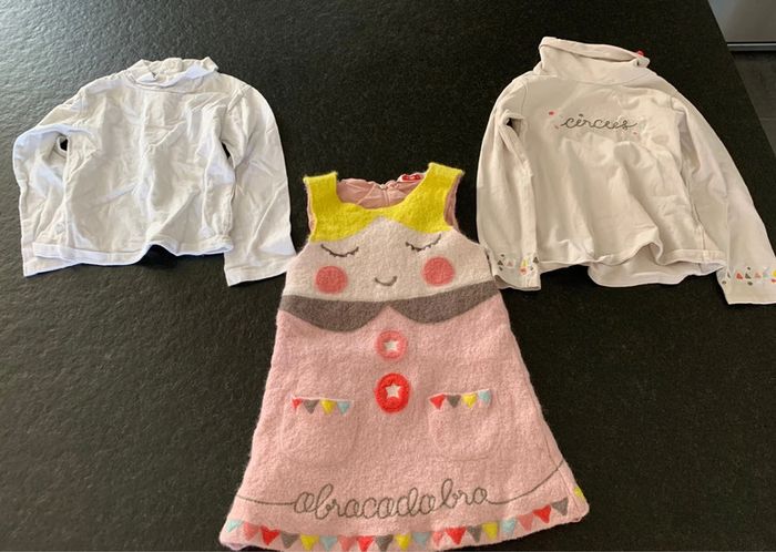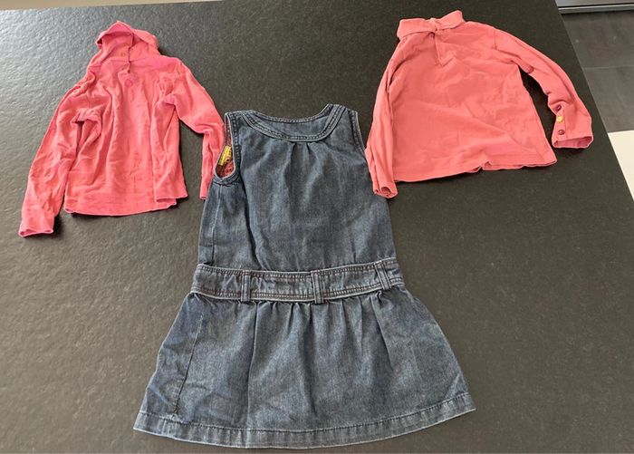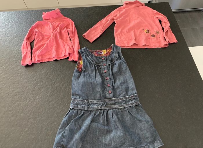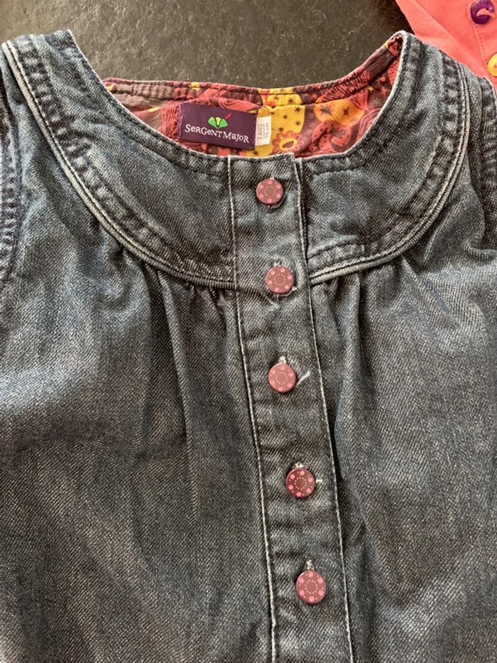 Lot comprenant: - 1 robe en jeans fermée par bouton sergent-major - 1 sous-pullrose motif, petite col fermé par pression (assorti à la robe) sergent-major - 1 sous pull petite rayure et dessin petite col fermé par pression sergent-major - 1 robe en jeans boule okaidi - 1 sous- pull rose motif biche (3 petits tâches sur col voir photo) obaïbi - 1 sous violet col claudine petit noeud en strass (1 tâche qui part peut-êtreau lavage voir photo) - 1 robe en laine bouille motif fille abec doublure du pareil au même - 1 sous pull beige assorti à la robe du pareil au même - 1 sous oul blanc motif petir ours rose sur une manche lulu castagnettes L203 #mejuge36mois