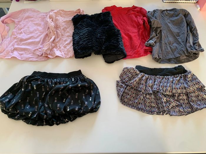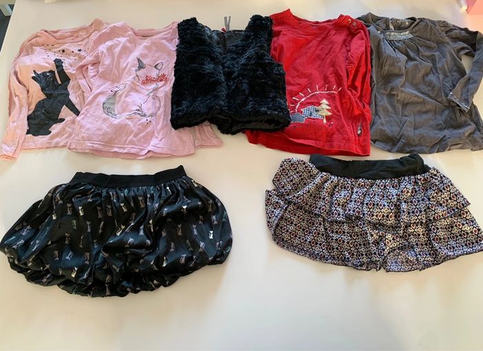 Lot comprenant: - 1 gilet fausse fourrure noir orchestra - 1 jupe boule taille élastique motif chat Okaïdi - 1 jupe à volants taille élastique - 1 t-shirt manches longues motifs chat noir et étoiles gemo - 1 t-shirt manches longues motif chat avec noeud Orchestra - 1 t-shirt manches longues rouge motifs sapin et maison sergent-major - 1 t- shirt manches longues taupe à paillettes CFK L281 #mejuge4ans