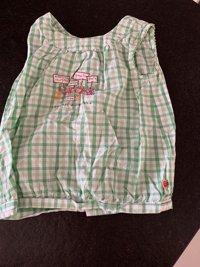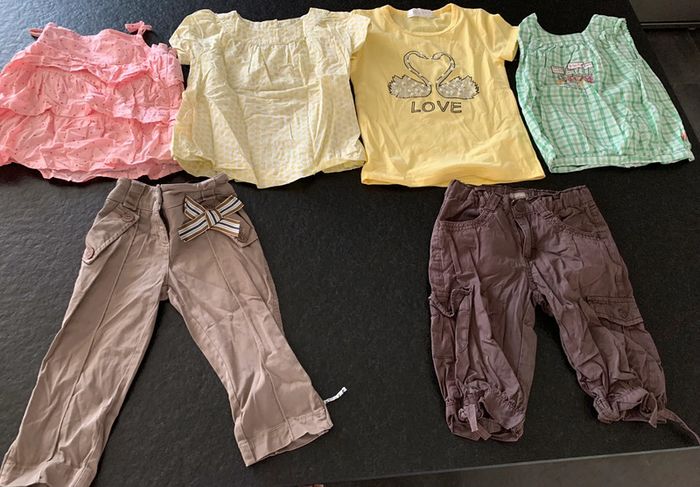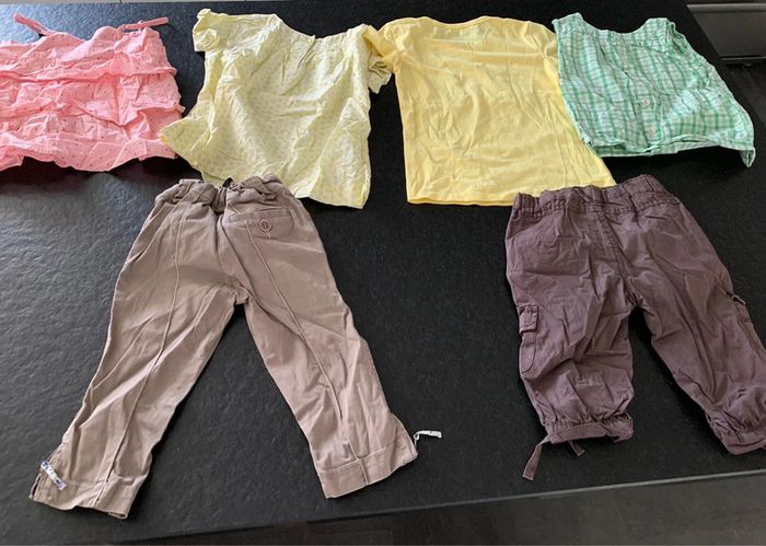 Lot comprenant: - 1 pantalon marron avec neoud lili gaufrette - 1 pantacourt marron in extenso - 1 blouse à brettelles volantées rose à pois violet vebaudet - 1 blouse sans manches vichy vert motif legumes sergent major - 1 blouse manches courtes motif pomme jaune Okaïdi - 1 t-shirtbmanches courtes motifs cignes kids & style L271 - 1 blouse manches #mejuge4ans