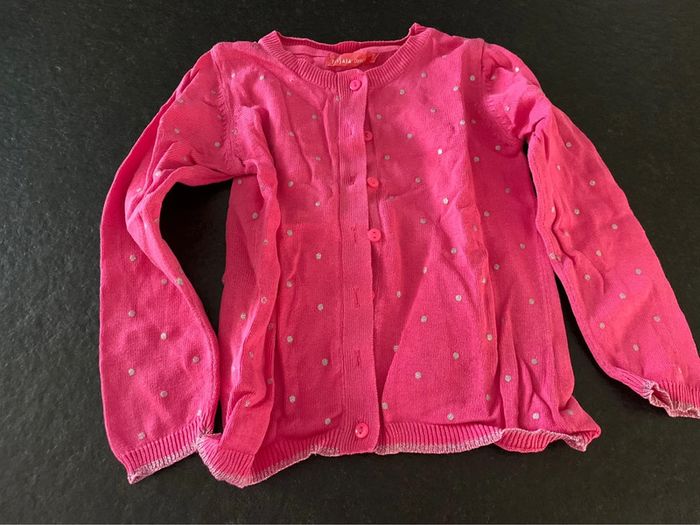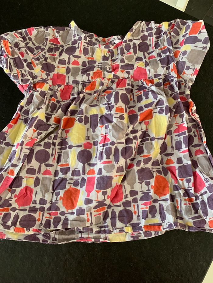Lot comprenant: - 1 robe sans manches sergent-major - 1 gilet rose à pois argenté tissaia - 1 bermuda avec noeud kidkanaï - 1 blouse manches courtes motif casseroles (ensemble avec le bermuda) kidkanaï L268 #mejuge4ans