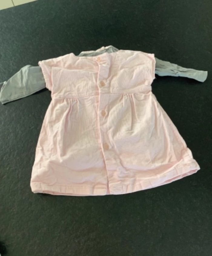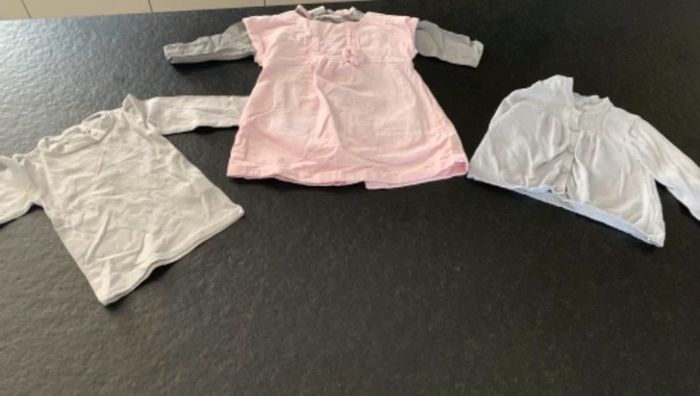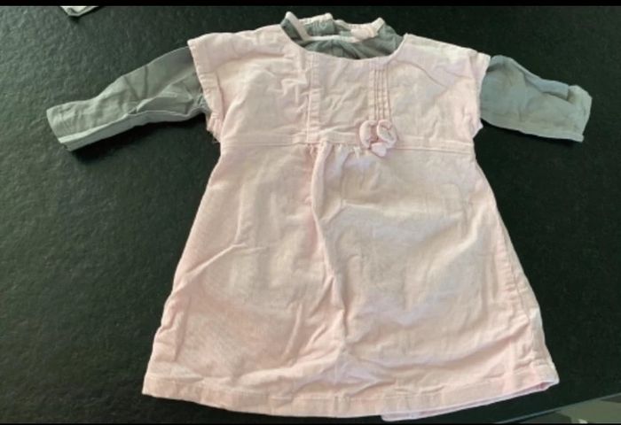Lot comprenant: - 1 robe velour rose - 1 gilet gris perle - 1 t-shirt gris liseré rose - 1 t-shirt gris perle (semble blanc sur photo) L9 #mejuge12mois